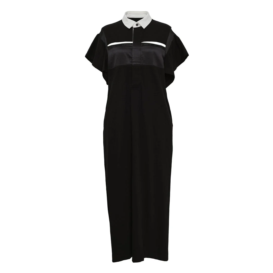 600078435BLK001 / 26-08351/00/001 - Contrast white collar detail - Graphic panel chest stripe - Short cap sleeves - Midi length silhouette - Premium cotton jersey construction - Relaxed fit - Signature hybrid design elements sacai Cotton Jersey Dress delivers hybrid design innovation with contemporary sportwear-luxury fusion. Crafted from premium cotton jersey in classic black with contrasting white collar and graphic panel detailing throughout. The architectural silhouette features sacai's signature deconstructed aesthetic and unexpected material combinations.