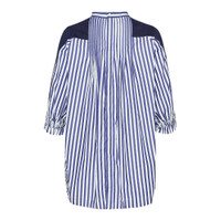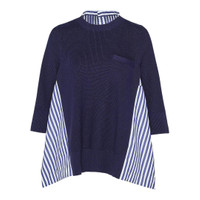600061489NVY001 / SCW-269/00/240 - Hybrid cotton knit and cotton poplin construction - Mock neck design with striped poplin collar - Three-quarter sleeves - Asymmetrical hem with striped fabric panels - Ribbed knit texture - Relaxed fit The sacai Cotton Knit x Cotton Poplin Top delivers innovative hybrid construction with signature deconstructed design. Made from premium ribbed cotton knit combined with crisp cotton poplin striping in navy and white, featuring contrasting textures and asymmetrical silhouette. The layered construction and sacai's signature fabric mixing technique create a contemporary statement piece that redefines modern knitwear.