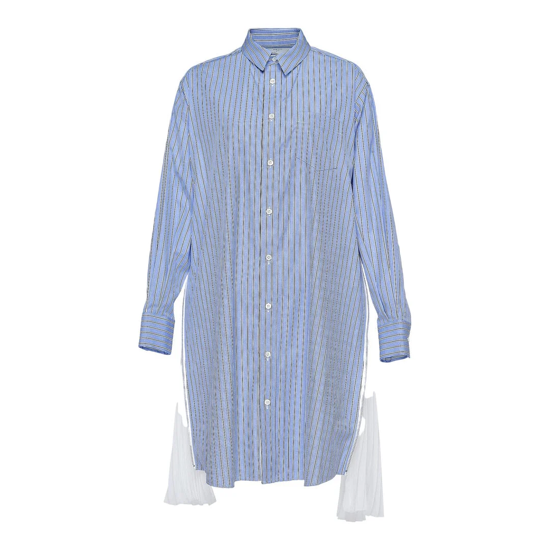 600051625LBL002 / SCW-225/00/458 - Button-front closure with collar - Long sleeves with button cuffs - Contrasting white pleated panels at hem - Asymmetric hemline design - Cotton poplin construction - Relaxed shirt-dress fit sacai Cotton Poplin Dress delivers innovative Japanese design with hybrid construction and contemporary silhouette. Crafted from crisp cotton poplin in classic blue pinstripe with contrasting white pleated panels at hem, featuring the brand's signature deconstructed aesthetic. The shirt-dress silhouette with asymmetric pleated detailing creates a sophisticated statement piece that bridges formal and casual wear.