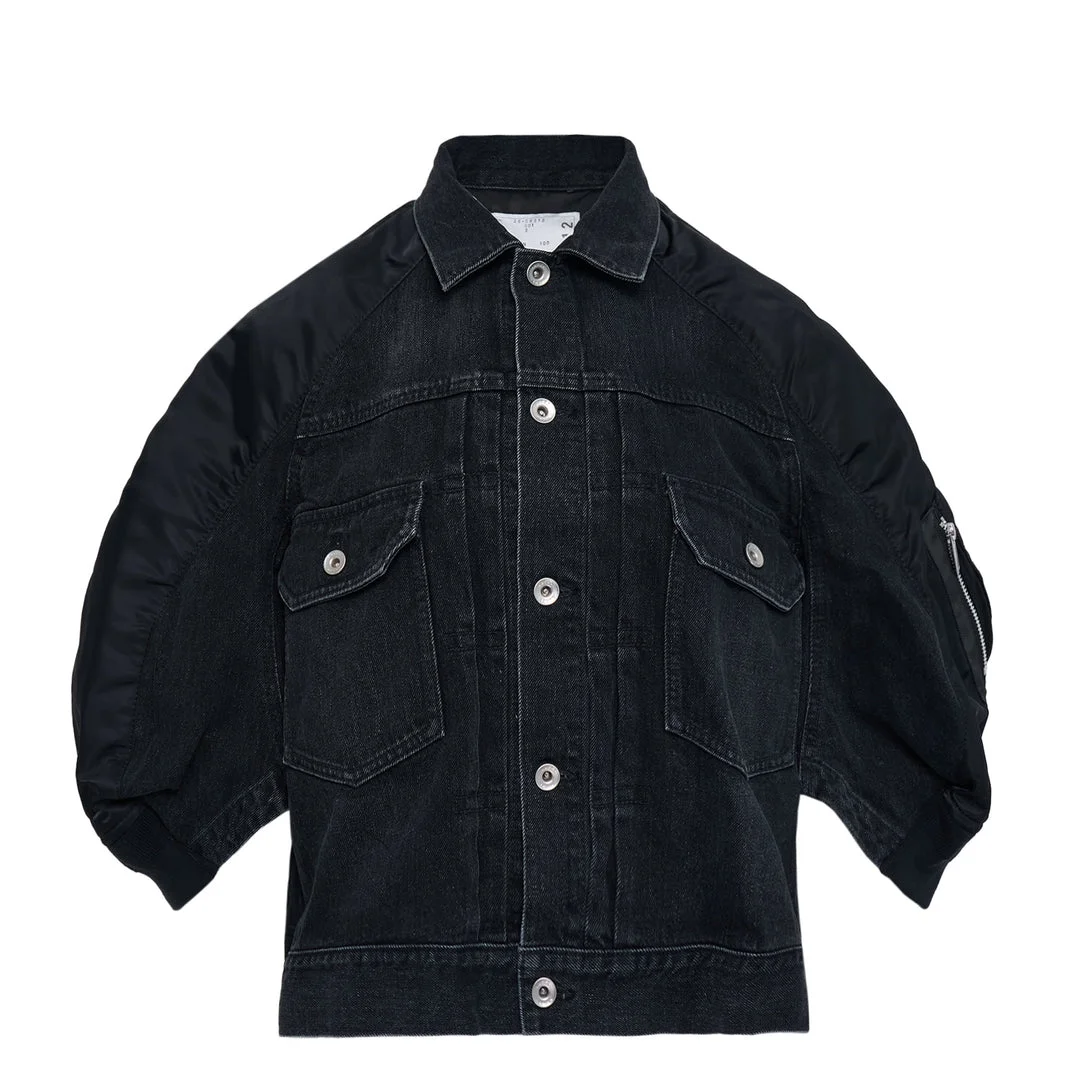600078361BLK001 / 26-08312/00/001 - Mixed material construction with denim and nylon twill - Silver-tone button closure - Chest flap pockets with button details - Contrast topstitching throughout - Bomber-style sleeves with ribbed cuffs - Regular fit silhouette The sacai Denim x Nylon Twill Jacket delivers hybrid innovation through the brand's signature material fusion approach. Crafted with black denim panels seamlessly integrated with technical nylon twill sleeves, featuring contrast stitching and silver-tone button closures. The deconstructed silhouette showcases sacai's architectural approach to contemporary Japanese fashion design.