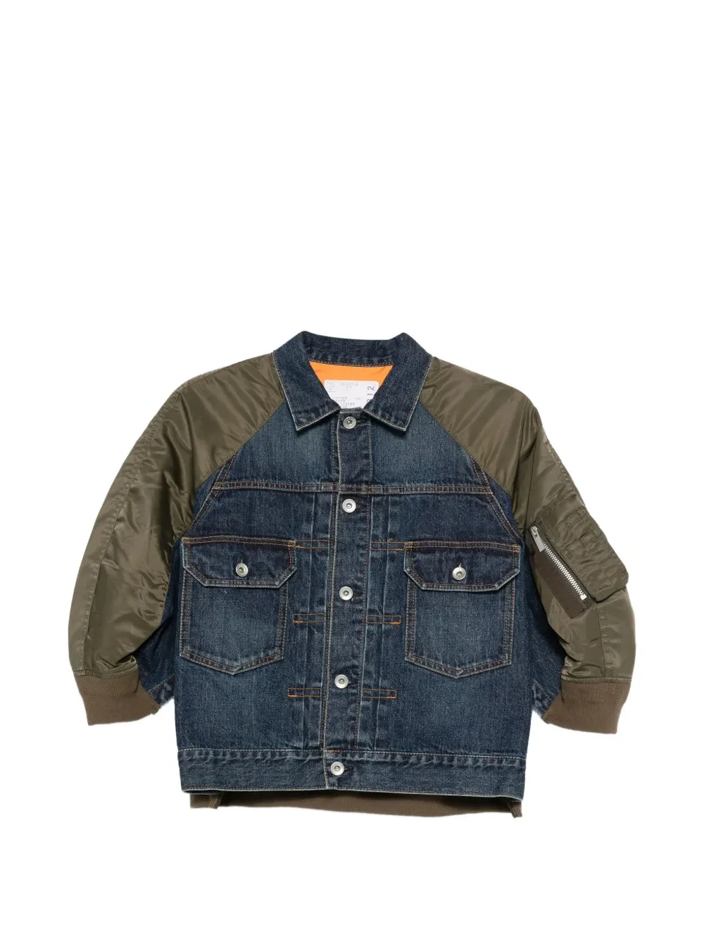 300051335BLU-01 / E626-08312/00/BLUExD/KHAKI - Indigo denim body with olive nylon twill sleeves - Classic denim collar and button closure - Dual chest pockets with button flaps - Ribbed cuffs and hem - MA-1 style sleeve pocket with zip - Contrasting topstitching throughout - Regular fit silhouette sacai Denim x Nylon Twill Jacket delivers innovative hybrid design through expert material juxtaposition and architectural construction. Crafted with indigo denim body panels combined with olive nylon twill sleeves, featuring contrasted stitching and utilitarian pocket detailing. The signature sacai design philosophy creates unexpected material combinations that redefine contemporary outerwear.