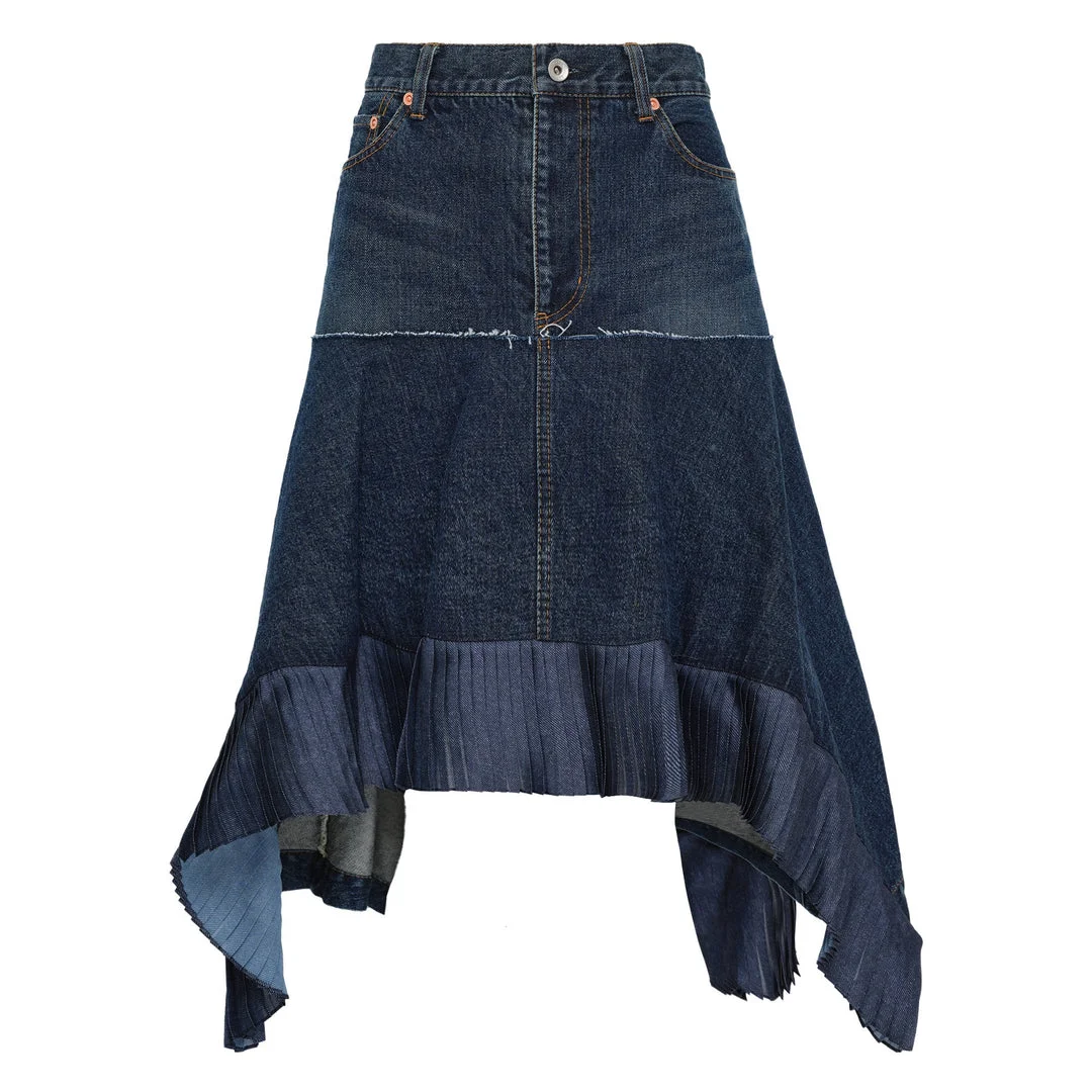 600078422BLU000 / 26-08315/00/401 - High-waisted denim construction - Button fly closure with metal hardware - Five-pocket styling - Contrasting pleated satin panels at hem - Raw edge detailing throughout - Asymmetric handkerchief hemline - Mixed blue denim washes - Regular fit through waist and hips sacai Denim x Satin Skirt delivers avant-garde femininity through innovative material mixing and deconstructed silhouettes. Crafted from premium denim with contrasting pleated satin panels, featuring raw edge detailing and asymmetric hemline construction. The hybrid design philosophy creates a distinctive piece that exemplifies sacai's signature approach to contemporary luxury.