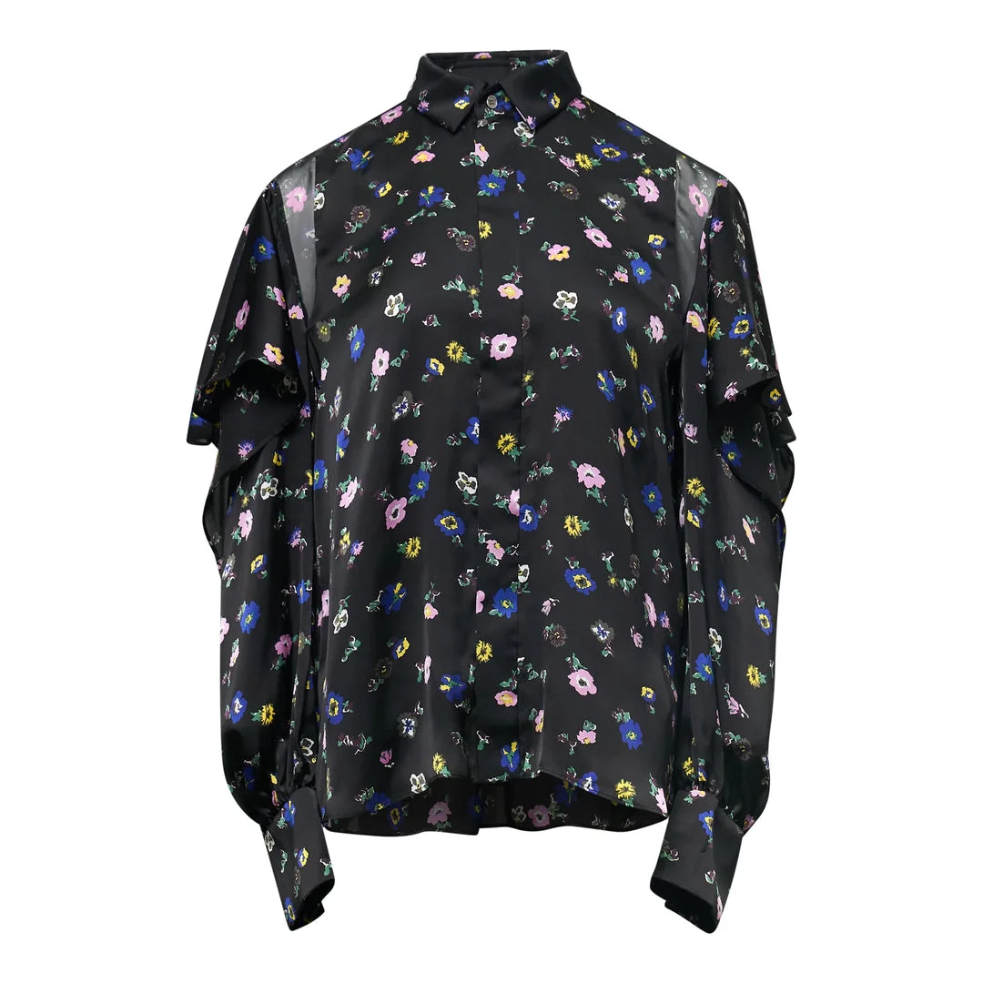 600078448BLK001 / 26-08383/00/001 - Semi-sheer lightweight fabric construction - Multicolored floral print on black base - Classic button-down collar - Dramatic ruffled long sleeves - Architectural draping details - Relaxed oversized fit The sacai Floral Print Blouse delivers contemporary femininity with the brand's signature avant-garde tailoring and innovative construction. Crafted from lightweight semi-sheer fabric in black with delicate multicolored florals, featuring dramatic ruffled sleeves and architectural draping. The deconstructed silhouette and unexpected proportions showcase sacai's mastery of reimagined classics.