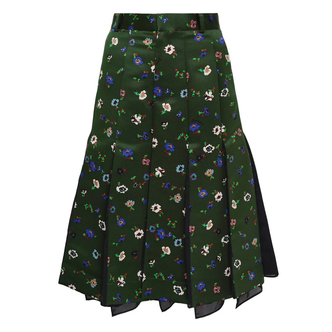 600078449GRN000 / 26-08385/00/551 - Elasticated waistband - Scattered floral print throughout - Asymmetrical pleated construction - Layered hemline with contrasting trim - Lightweight flowing fabric - Mid-length silhouette - A-line fit sacai Floral Print Skirt delivers contemporary femininity with the brand's signature hybrid construction and unexpected design elements. Crafted from lightweight fabric in deep forest green with scattered multicolored floral motifs, featuring asymmetrical pleating and layered hemlines. The deconstructed silhouette and mixed proportions create sacai's distinctive avant-garde aesthetic for modern wardrobes.