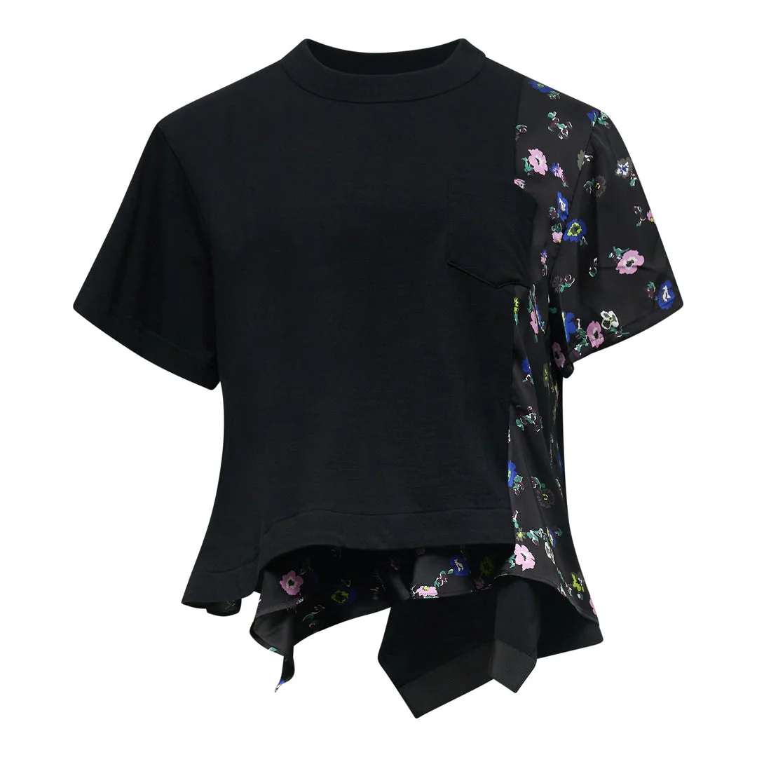600078453BLK001 / 26-08389/00/002 - Mixed fabric construction with floral print panel - Asymmetric hemline with draped detail - Crew neckline - Short sleeves - Contrast floral print on right sleeve - Premium cotton jersey base - Relaxed fit The sacai Floral Print T-Shirt delivers avant-garde Japanese design with signature hybrid construction and contemporary street style. Crafted from premium cotton jersey in classic black with contrasting floral panel detailing on the right sleeve and asymmetric hem. The innovative mixed-media approach and deconstructed silhouette showcase sacai's mastery of fabric combination and architectural draping.