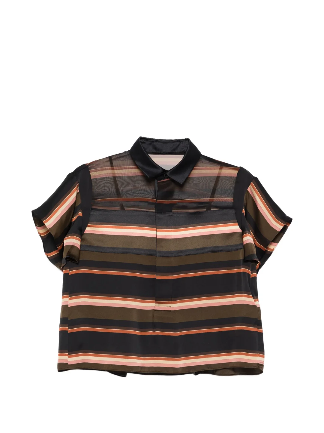 300051662KHA-01 / E626-08372/00/KHAKIxPINK - Sheer chiffon overlay construction - Contrast mesh panel inserts - Structured collar with button placket - Short sleeves with rolled cuffs - Multi-tonal horizontal stripe pattern - Relaxed oversized fit - Lightweight semi-transparent fabric The sacai Horizontal Stripe Pullover delivers avant-garde layering with signature deconstructed design elements. Crafted from lightweight chiffon overlay with bold horizontal stripes in black, olive, coral and cream tones, featuring contrast mesh panels and structured collar details. The innovative construction and sacai's signature fabric mixing create a contemporary statement piece that redefines modern shirting.