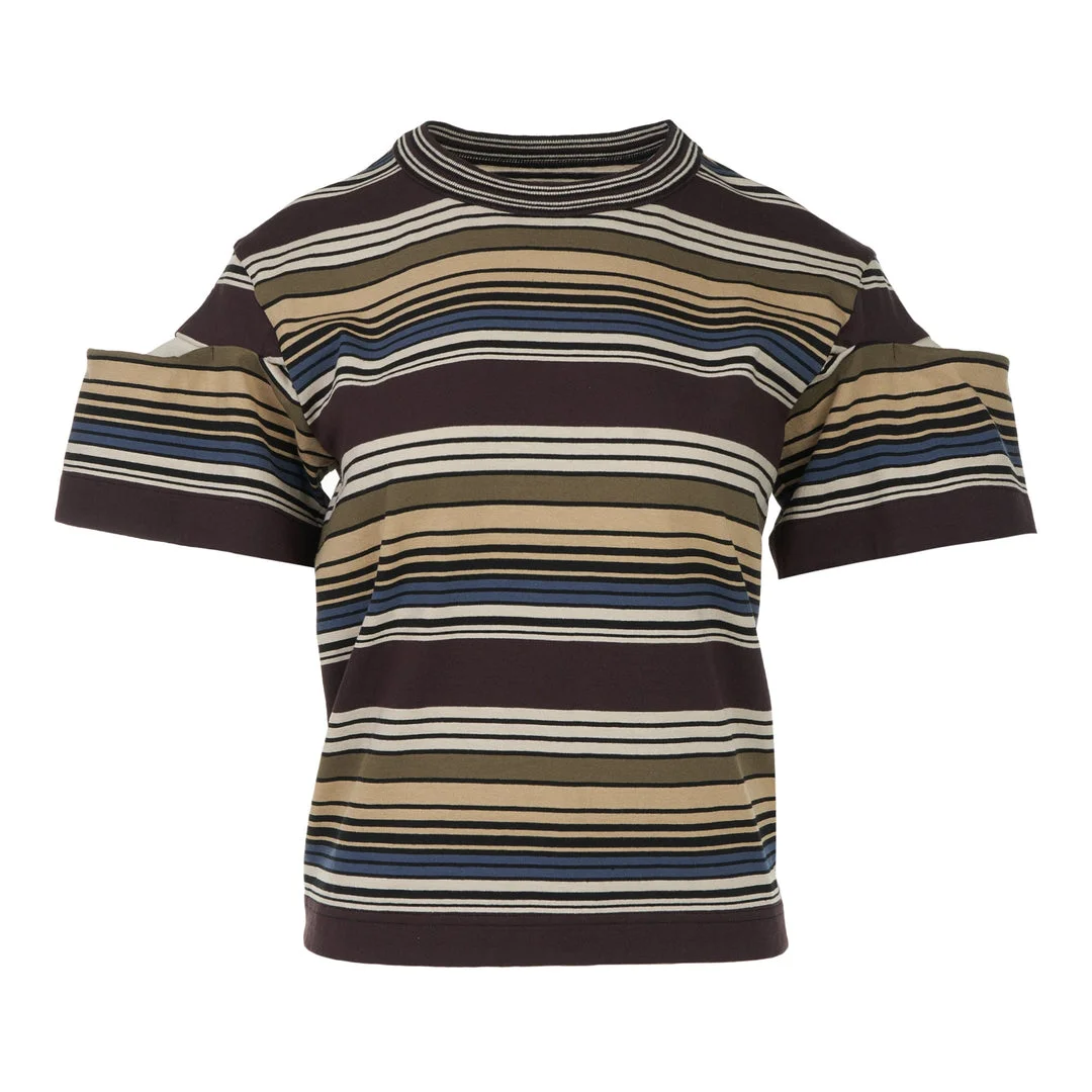 300050794BRN-01 / E626-08380/00/BROWN BEIGE - Cold-shoulder cutout design - Multi-tonal horizontal stripe pattern - Short sleeves with exposed shoulders - Mock neck collar - Premium cotton jersey construction - Regular fit sacai Horizontal Stripe T-Shirt delivers avant-garde design with deconstructed silhouette and contemporary edge. Crafted from premium cotton jersey featuring multi-tonal stripe pattern in brown, blue, and cream colorway with cold-shoulder cutout details. The signature sacai aesthetic combines classic striped motifs with innovative construction for modern streetwear appeal.