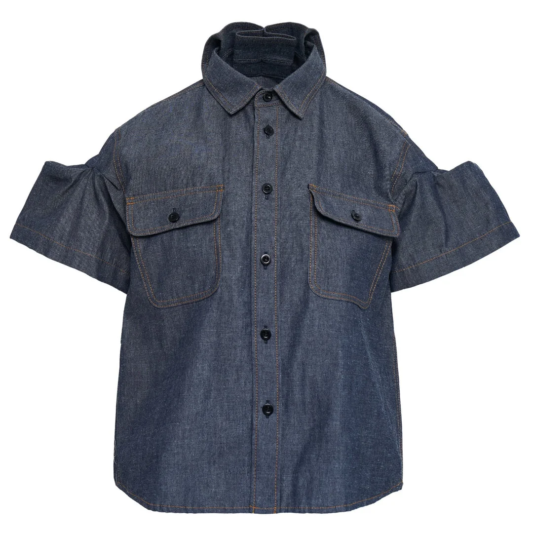 600078421BLU001 / 26-08314/00/401 - Lightweight indigo denim construction - Contrast orange topstitching throughout - Classic point collar - Button-up front closure - Dual chest pockets with flap closures - Long sleeves with button cuffs - Oversized relaxed fit - Curved hem design The sacai Light Weight Denim Shirt delivers contemporary Japanese design with relaxed sophistication and innovative construction. Crafted from lightweight indigo denim with contrast orange topstitching, featuring the brand's signature architectural approach to classic silhouettes. The oversized fit and deconstructed details create a modern interpretation of traditional workwear aesthetics.