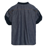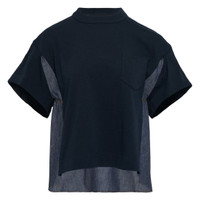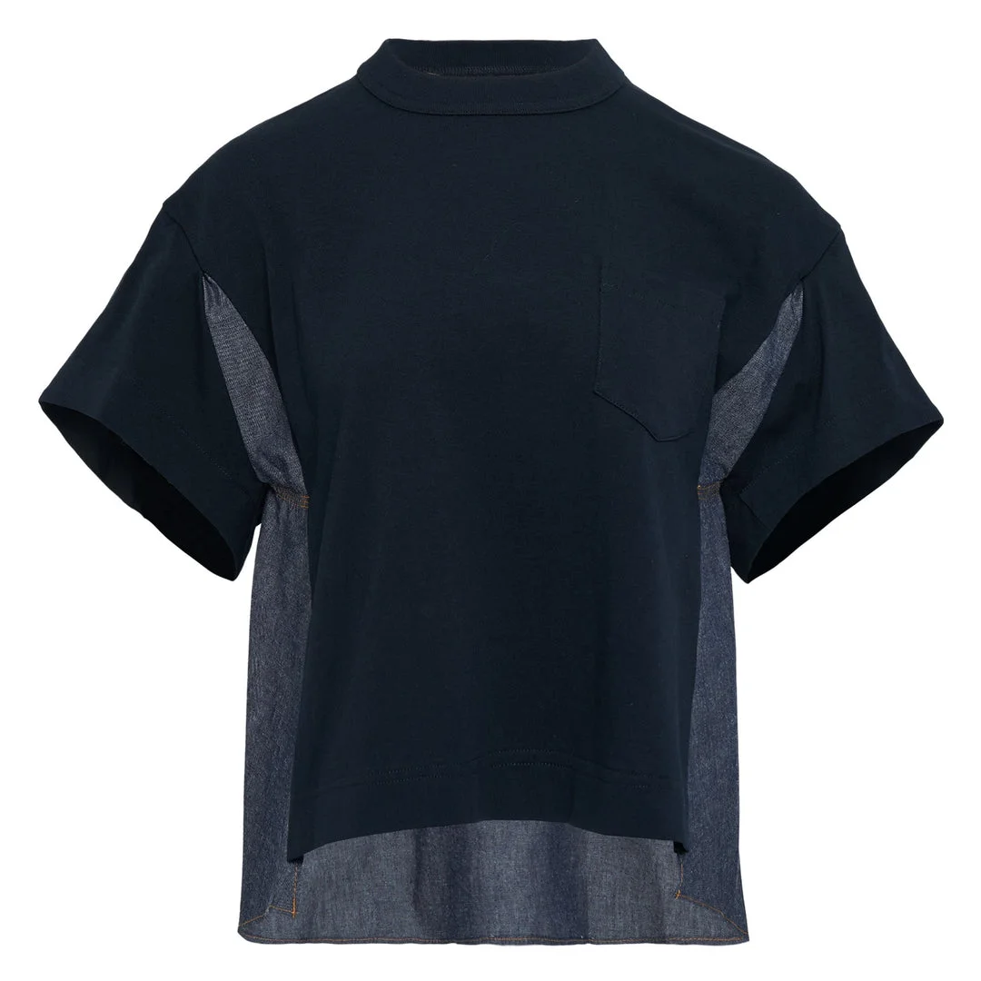 600078369NVY001 / 26-08348/00/210 - Mixed denim and cotton jersey construction - Mock turtleneck collar - Short sleeves - Contrasting fabric panels - Chest pocket detail - Relaxed oversized fit - Lightweight construction The sacai Light Weight Denim x Cotton Jersey delivers innovative hybrid construction with the brand's signature mixed-material approach. Crafted from lightweight denim panels combined with soft cotton jersey in deep navy, featuring contrasting textures and deconstructed design elements. The architectural layering and unexpected fabric combinations create a distinctive piece that embodies sacai's avant-garde aesthetic.