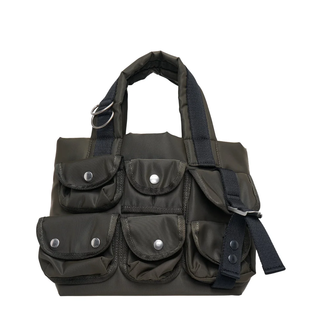 600078350KHA0OS / 26-01098S/00/531 - Multiple front flap pockets with snap closures - Adjustable shoulder strap with D-ring hardware - Dual carry handles with padded grip - Durable nylon construction - Black webbing trim details - Compact tote size The sacai Nylon Tote Bag Small delivers tactical-inspired functionality with contemporary streetwear aesthetics. Crafted from durable olive green nylon with black webbing straps and multiple flap pockets secured with metal snap closures. The utilitarian design and compact size make it perfect for urban exploration and everyday essentials.