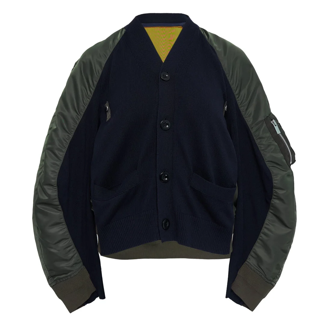 600078418NVY001 / 26-08309/00/233 - Navy knit body with button front closure - Olive green nylon twill sleeves - Ribbed collar, cuffs and hem - Front patch pockets - Zip pocket detail on sleeve - Hybrid cardigan-bomber construction - Regular fit The sacai Nylon Twill x Knit Cardigan delivers innovative hybrid design with the brand's signature fabric mixing approach. Crafted from contrasting navy knit body with olive green nylon twill sleeves, featuring ribbed collar and cuffs with bomber-style construction. The deconstructed silhouette and mixed-material aesthetic exemplify sacai's avant-garde approach to contemporary menswear.