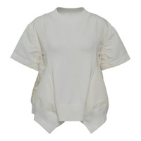 600070010OWT003 / 25-07997/00/378 - Hybrid nylon twill and knit construction - Crew neckline - Short sleeves - Asymmetrical panel design - Contrast texture details - Relaxed fit sacai Nylon Twill x Knit Pullover delivers innovative hybrid construction with the brand's signature fabric-mixing technique. Crafted from a combination of structured nylon twill panels and soft knit jersey in cream, featuring asymmetrical design elements and contrast textures. The deconstructed silhouette showcases sacai's avant-garde approach to modern wardrobe essentials.