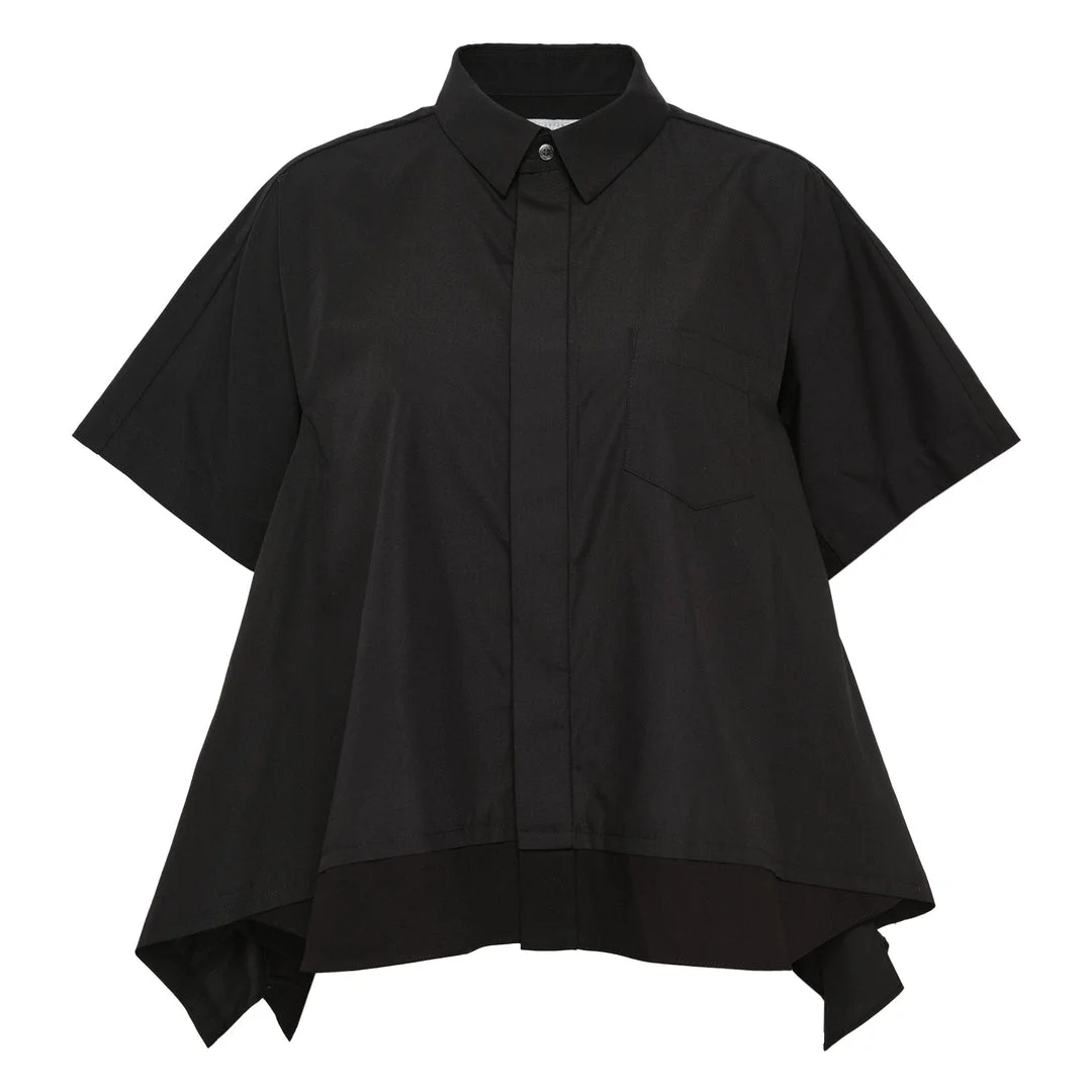 600078368BLK001 / 26-08329/00/001 - Classic point collar - Short sleeves - Button-front closure - Chest pocket detail - Asymmetrical flared hemline - Oversized relaxed fit - Premium cotton poplin construction sacai Poplin Shirt delivers avant-garde femininity with architectural silhouette and contemporary edge. Crafted from premium cotton poplin in sophisticated black, featuring an asymmetrical flared hemline that creates dramatic movement. The oversized fit and deconstructed tailoring showcase sacai's signature fusion of classic and experimental design.