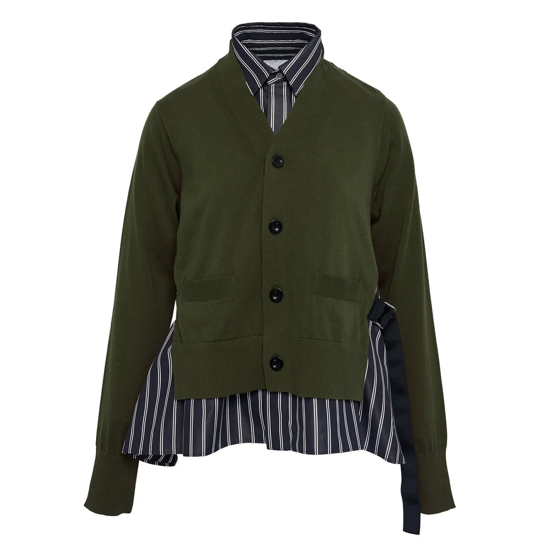 600078456BRN001 / 26-08401/00/634 - Button-front closure with four buttons - Contrast pinstripe poplin collar and cuffs - Extended poplin hem panels - Side tie detail - Ribbed hem and cuffs - Mixed cotton construction - Relaxed fit sacai Poplin x Cotton Knit Cardigan delivers innovative hybrid construction with signature design fusion. Crafted from olive green cotton knit body with navy pinstripe poplin shirt details, featuring contrast collar and hem extensions. The deconstructed silhouette and mixed-material approach create sacai's signature avant-garde aesthetic.