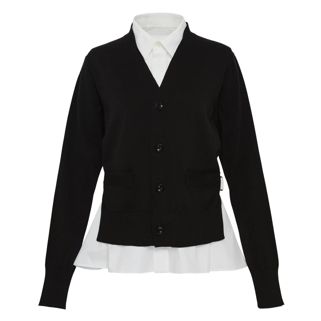 600078456BLK001 / 26-08401/00/004 - Black cotton knit construction - White poplin shirt underlayer - Four-button front closure - V-neck design - Long sleeves - Layered hybrid silhouette - Regular fit The sacai Poplin x Cotton Knit Cardigan delivers hybrid construction with the brand's signature fabric mixing technique. Crafted from black cotton knit body with crisp white poplin shirt panels, featuring button closure and layered silhouette. The deconstructed design combines knitwear comfort with tailored shirt elements for sacai's distinctive aesthetic.