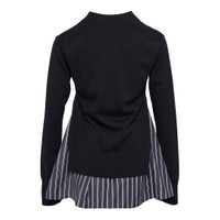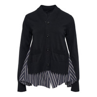 600070018BLK003 / 25-08011/00/044 - Button-front closure with four buttons - Contrasting striped poplin hem panels - Asymmetrical hemline construction - Front patch pockets - Long sleeves with ribbed cuffs - Hybrid knit and woven fabric construction - Regular fit The sacai Poplin x Knit Cardigan delivers hybrid construction with innovative material mixing and deconstructed tailoring. Crafted from premium knit fabric with contrasting striped poplin panels at the hem, featuring the brand's signature fabric-splicing technique. The asymmetrical hemline and unexpected material combinations create a contemporary statement piece with sacai's distinctive design philosophy.