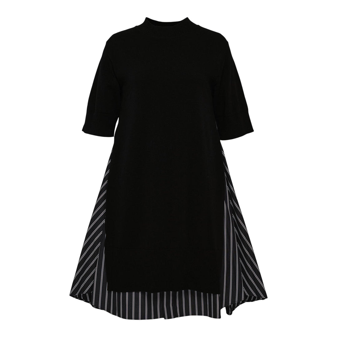 600070017BLK001 / 25-08010/00/044 - Mock neck collar - Elbow-length sleeves - Black knit jersey upper construction - White pinstriped poplin hem panels - Asymmetrical hemline - Relaxed fit through body - Hybrid fabric construction sacai Poplin x Knit Dress delivers innovative hybrid construction with the brand's signature material fusion technique. Crafted from black knit jersey with contrasting white pinstriped poplin panels creating asymmetrical lower hem detail. The mock neck design and elbow-length sleeves showcase sacai's distinctive approach to deconstructed tailoring.