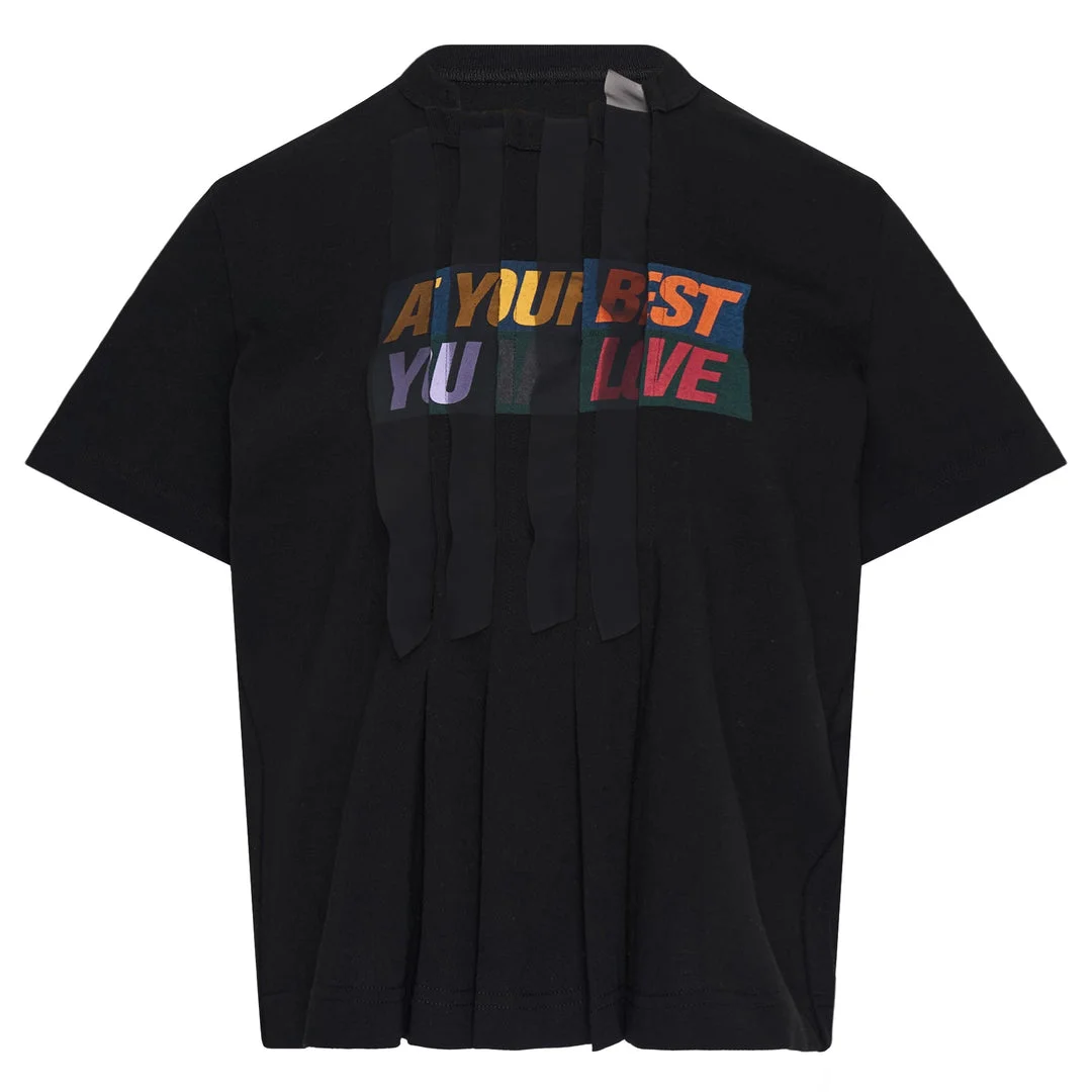 600081715BLK001 / 26-08495/00/001 - Colorful block letter graphic print - Dimensional fabric construction details - Short sleeves with raw edge finish - Crew neckline - Premium cotton jersey construction - Relaxed fit with deconstructed elements The sacai Print T-Shirt delivers contemporary streetwear with the brand's signature deconstructed aesthetic and bold graphic elements. Crafted from premium cotton jersey in deep black, featuring colorful block letter graphics across the chest with dimensional fabric construction details. The layered silhouette and innovative textile manipulation create a statement piece that embodies sacai's avant-garde Japanese design philosophy.