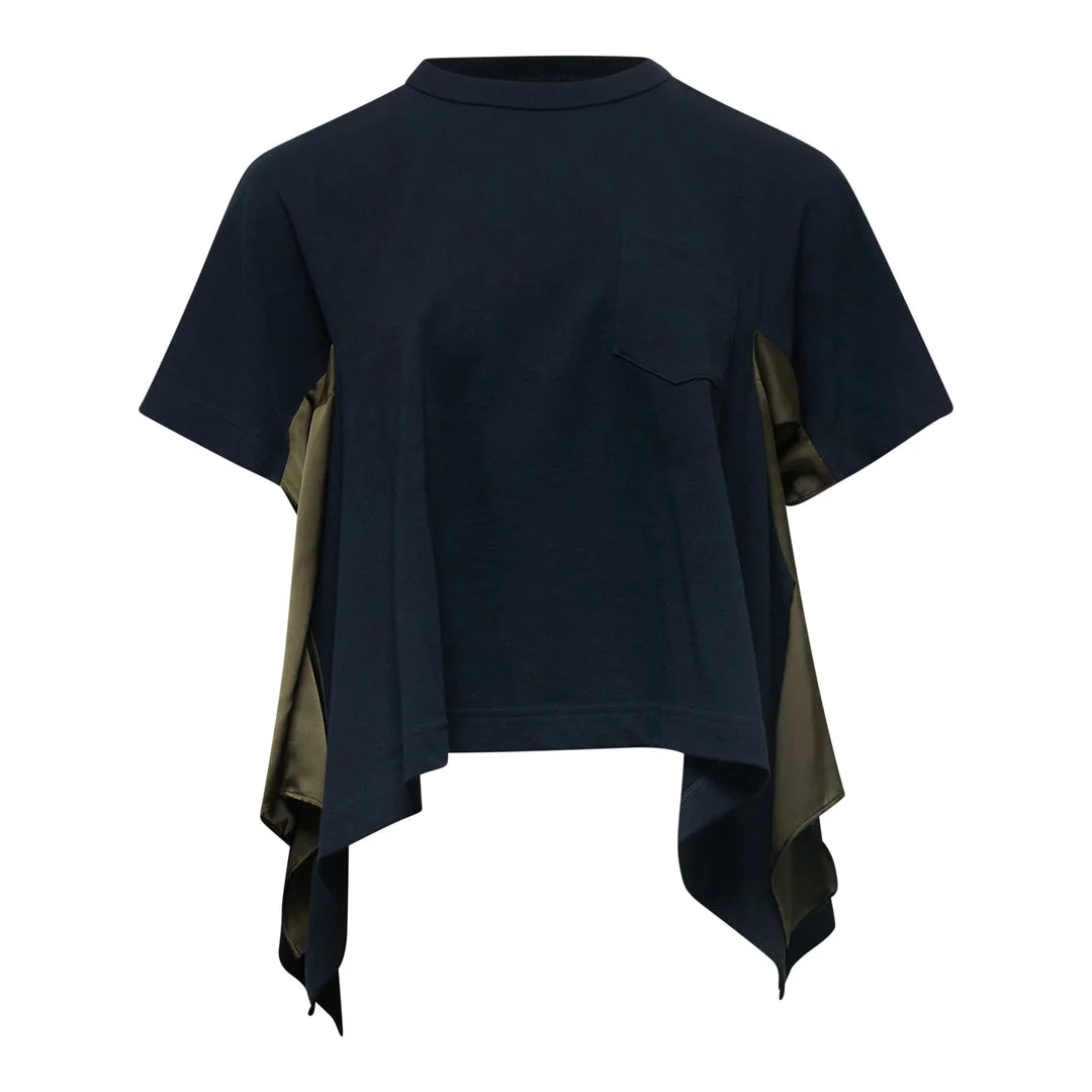 600078459NVY001 / 26-08404/00/212 - Mixed fabric construction with cotton jersey and satin panels - Mock neck collar - Short sleeves - Asymmetric hemline with draped extensions - Contrast olive green satin inserts - Relaxed fit - Single chest pocket sacai Satin x Cotton Jersey T-Shirt delivers hybrid fabric innovation with the brand's signature deconstructed aesthetic. Crafted from premium cotton jersey front panel combined with lustrous satin contrast panels and flowing asymmetric draping. The experimental silhouette and mixed-material construction showcase sacai's expertise in fabric manipulation and avant-garde design.