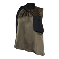 300048767KHA-01 / P525-07947/00/505 - Mock turtleneck with black ribbon tie - Sleeveless design - Contrasting navy blue panel detail - Asymmetrical hemline - Mixed suiting fabric construction - Relaxed fit The sacai Suiting Mix Pullover delivers hybrid design innovation with deconstructed tailoring and avant-garde silhouettes. Crafted from contrasting olive green fabric with navy blue panel detailing and black ribbon tie accents at the mock neckline. The asymmetrical construction and signature sacai fabric mixing create a statement piece that redefines contemporary suiting.
