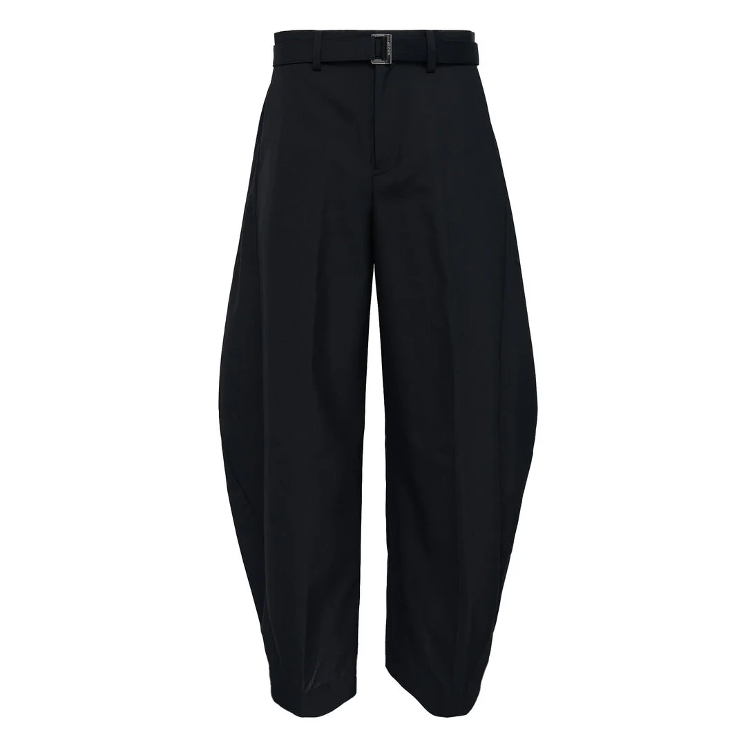 600078534BLK001 / 26-03901M/00/001 - High-waisted design with belt detail - Balloon-leg silhouette with tapered ankles - Front zip closure - Side seam pockets - Premium suiting fabric construction - Structured waistband - Cropped length - Relaxed fit through thighs sacai Suiting Pants deliver avant-garde Japanese tailoring with contemporary architectural silhouette and innovative construction. Crafted from premium suiting fabric in deep navy, featuring the brand's signature deconstructed approach with exaggerated proportions and modern balloon-leg cut. The structured waistline with belt detail and tapered ankles create sacai's distinctive hybrid aesthetic that bridges formal and experimental design.