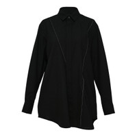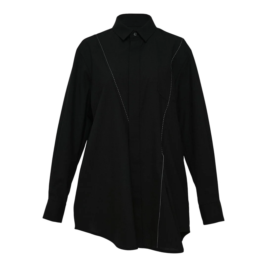 600069993BLK001 / 25-07943/00/001 - Classic point collar - Long sleeves with button cuffs - Front button closure - Contrasting white topstitching detail - Asymmetric hemline - Deconstructed tailoring - Premium suiting fabric construction - Relaxed oversized fit The sacai Suiting Shirt delivers avant-garde tailoring with the brand's signature deconstructed aesthetic and hybrid construction approach. Crafted from premium suiting fabric in classic black, featuring contrasting white topstitching that highlights the architectural seaming and asymmetric hemline. The innovative design merges formal shirting with contemporary draping for a sophisticated yet unconventional silhouette.