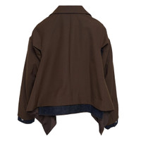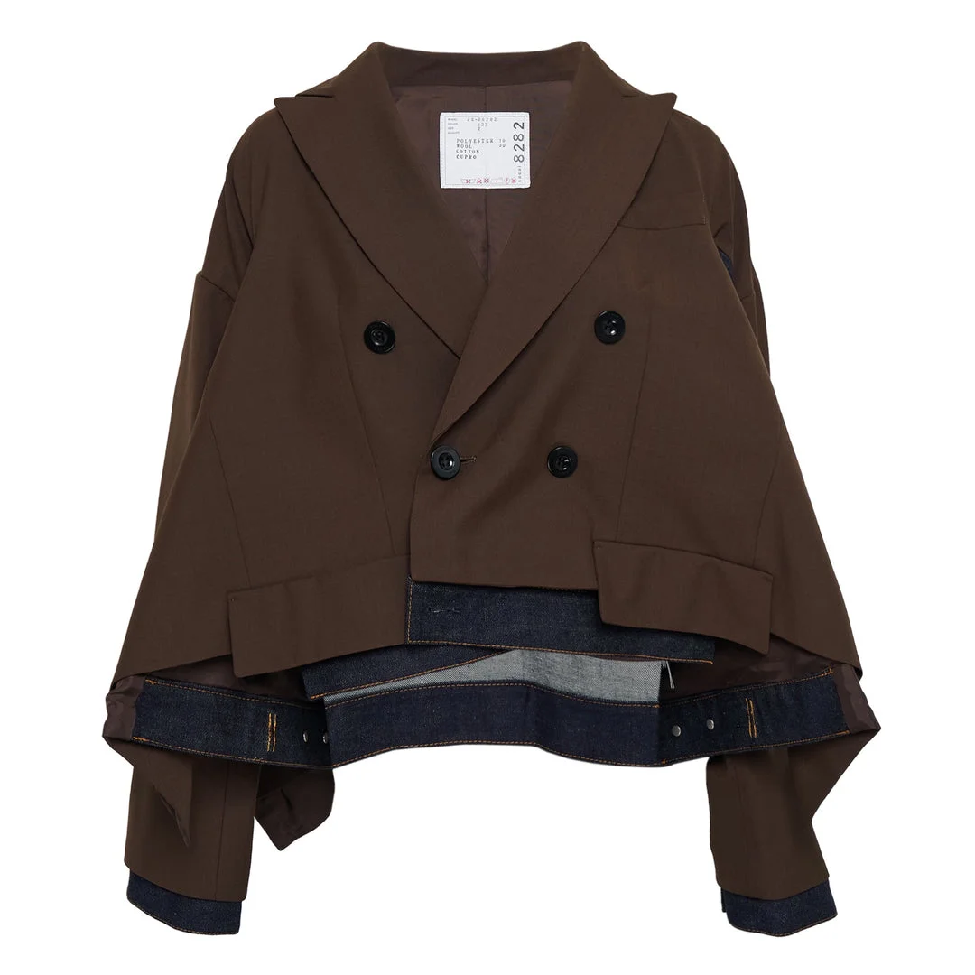 600078410BRN001 / 26-08282/00/633 - Double-breasted button closure - Peak lapels - Suiting fabric upper construction - Raw denim contrast panels and belt - Welt pockets - Deconstructed hemline - Hybrid material construction - Tailored fit sacai Suiting x Denim Jacket delivers innovative hybrid construction with the brand's signature fusion aesthetic. Crafted from structured brown suiting fabric combined with raw denim panels, featuring double-breasted closure and deconstructed tailoring. The contrasting materials and layered silhouette exemplify sacai's pioneering approach to contemporary design.