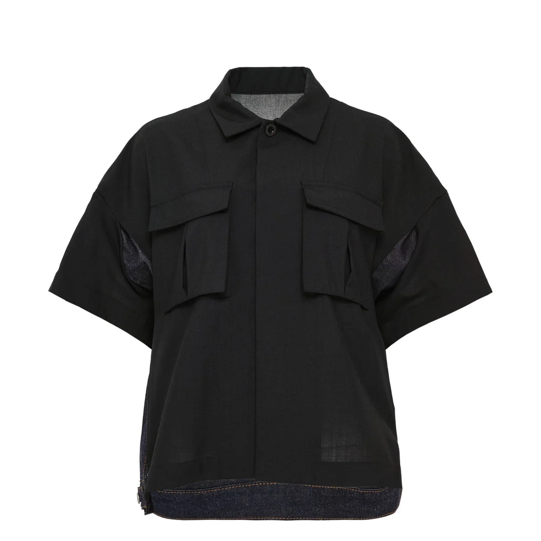 600078351BLK001 / 26-08283/00/027 - Mixed suiting and denim construction - Oversized relaxed fit - Classic point collar - Chest flap pockets - Short sleeves - Contrast material paneling - Hidden button placket The sacai Suiting x Denim Shirt delivers hybrid luxury through innovative mixed-material construction. Crafted with structured suiting fabric combined with premium denim accents, featuring the brand's signature contrast paneling and architectural silhouette. The unexpected material pairing and oversized fit create a contemporary statement piece that bridges formal and casual wear.