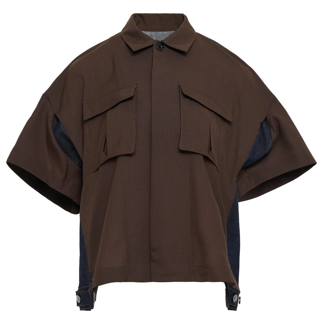 600078351BRN001 / 26-08283/00/633 - Brown suiting fabric front panel - Indigo denim side panels - Oversized short sleeves - Point collar with button closure - Dual chest pockets with flaps - Relaxed oversized fit - Contrast fabric construction sacai Suiting x Denim Shirt delivers hybrid design innovation with contrasting fabrications and architectural construction. Crafted from brown suiting fabric with indigo denim side panels and contrasting textures throughout. The signature sacai layered aesthetic and oversized silhouette create a statement piece that redefines contemporary shirting.
