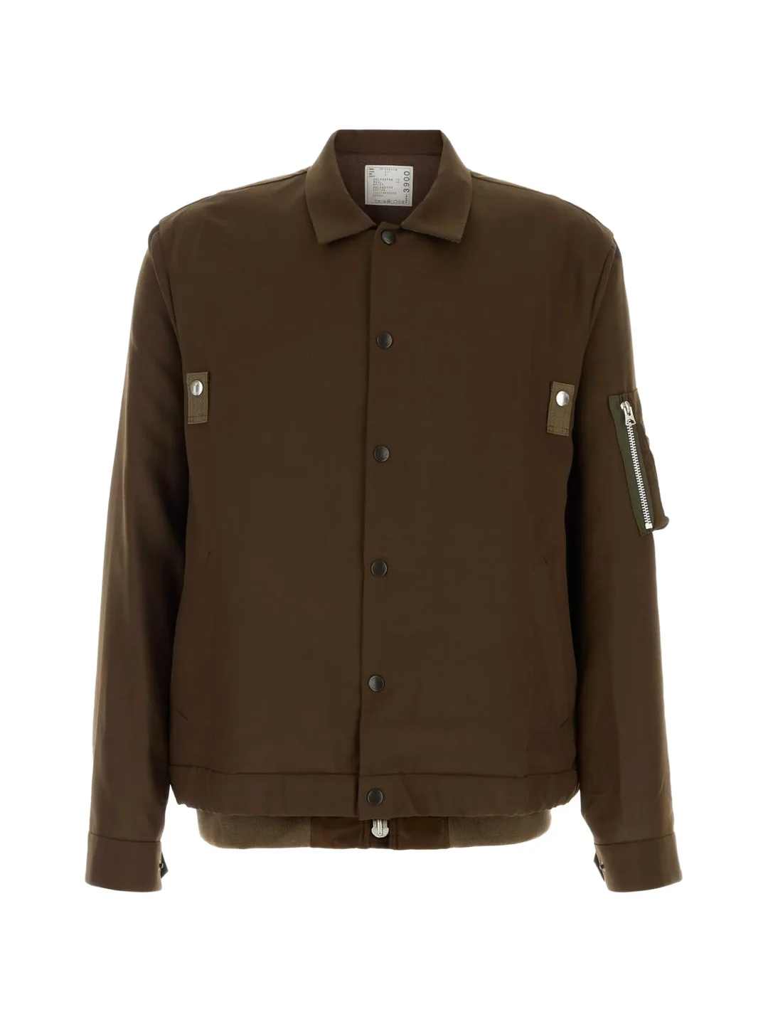 600078533BRN002 / 26-03900M/00/601 - Snap button front closure - Ribbed collar, cuffs and hem - Chest patch pockets with snap closures - MA-1 style zip pocket on left sleeve - Mixed fabric construction - Regular fit bomber silhouette - Drawstring hem adjustment The sacai Suiting x Nylon Twill Blouson delivers hybrid tailoring with the brand's signature fabric mixing philosophy. Crafted from luxurious suiting fabric combined with technical nylon twill in deep olive green, featuring structured bomber silhouette with utilitarian details. The contrast of formal and casual materials creates sacai's distinctive deconstructed aesthetic for contemporary layering.