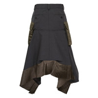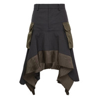600078353GRY001 / 26-08285/00/342 - Mixed material construction with suiting and nylon twill - Asymmetrical handkerchief hemline - Cargo pockets with flap closures - Pleated fabric inserts - High-waisted fit - Back zip closure - Unlined construction The sacai Suiting x Nylon Twill Skirt delivers avant-garde femininity through innovative material mixing and asymmetrical construction. Crafted from premium suiting fabric combined with technical nylon twill panels, featuring pleated inserts and cargo pocket details. The deconstructed silhouette with handkerchief hemline showcases sacai's signature hybrid design philosophy.