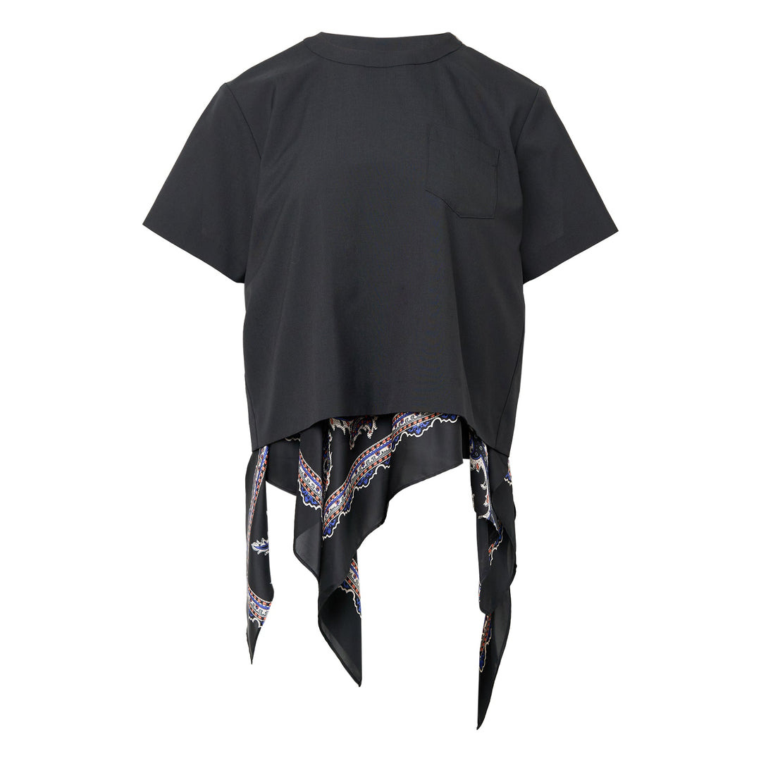 600071797BLK002 / 25-08132/00/002 - Mixed fabric construction - Suiting fabric upper body - Paisley print contrast panels - Asymmetric hemline - Short sleeves - Relaxed fit - Crew neckline The sacai Suiting x Paisley Print Pullover delivers hybrid design with the brand's signature fabric mixing technique. Crafted from structured suiting fabric on top with contrasting paisley print panels at the hem, creating an unexpected layered silhouette. The deconstructed design and signature sacai fabric play elevate traditional shirting with contemporary edge.