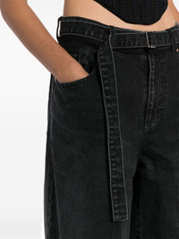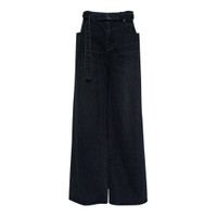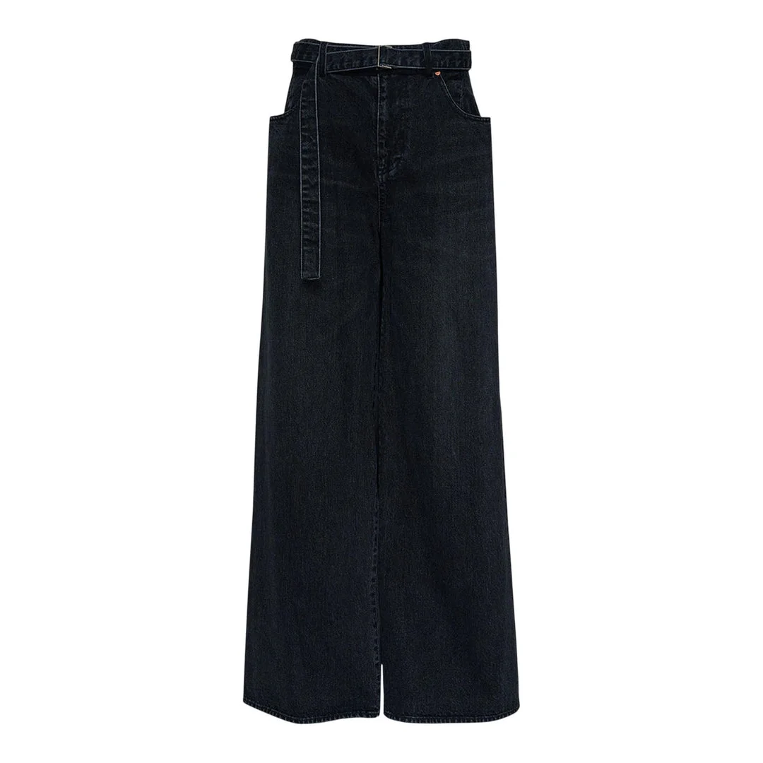 600051621BLK001 / SCW-210/00/001 - High-waisted design with belt loops - Matching fabric belt included - Front zip and button closure - Five-pocket styling - Wide leg silhouette - Premium cotton denim construction - Relaxed fit sacai Wide Denim Pants deliver contemporary Japanese design with relaxed silhouette and architectural proportions. Crafted from premium cotton denim in deep indigo wash, featuring the brand's signature deconstructed aesthetic and modern tailoring. The wide-leg construction and high-waisted profile create a bold statement piece that bridges streetwear and luxury fashion.