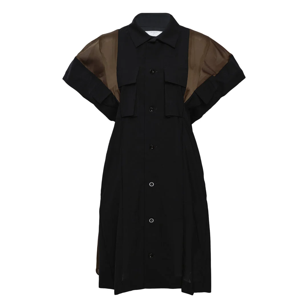 600081703NVY001 / 26-08427/00/212 - Button-front closure with concealed placket - Classic shirt collar - Contrasting brown panel detailing - Chest patch pockets - Short sleeves with extended shoulder line - Asymmetrical hemline - Premium wool suiting construction - Relaxed fit The sacai Wool Suiting Dress delivers Japanese avant-garde design with sophisticated tailoring and contemporary edge. Crafted from premium wool suiting fabric in black with contrasting brown leather-like panel detailing across the shoulders and sleeves. The structured shirt-style construction and asymmetrical hemline create sacai's signature hybrid aesthetic.