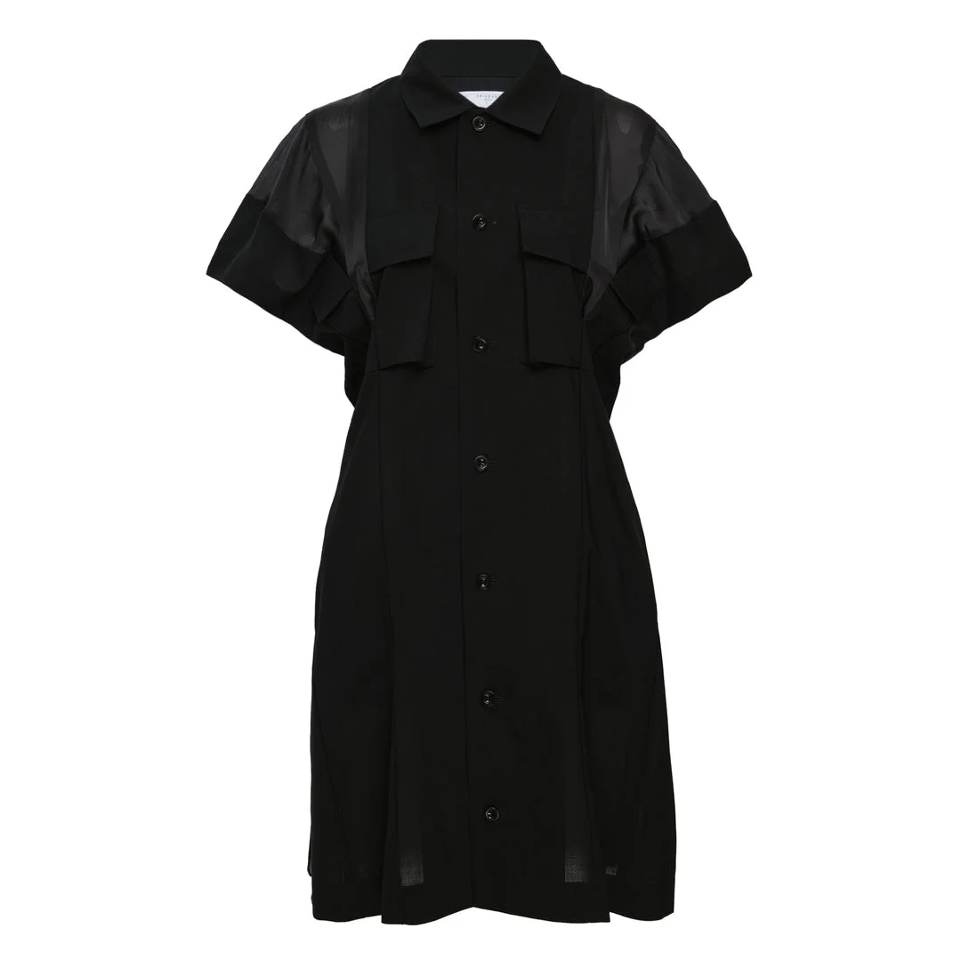 600081703BLK001 / 26-08427/00/001 - Premium wool suiting construction - Sheer mesh panel details - Classic shirt collar design - Button-front closure - Short sleeve styling - Contrast fabric paneling - Structured fit The sacai Wool Suiting Dress delivers avant-garde sophistication with innovative layering techniques and architectural construction. Crafted from premium wool suiting fabric in classic black, featuring signature contrast paneling and transparent mesh inserts throughout. The structured silhouette combines formal tailoring with sacai's deconstructed aesthetic for contemporary luxury dressing.