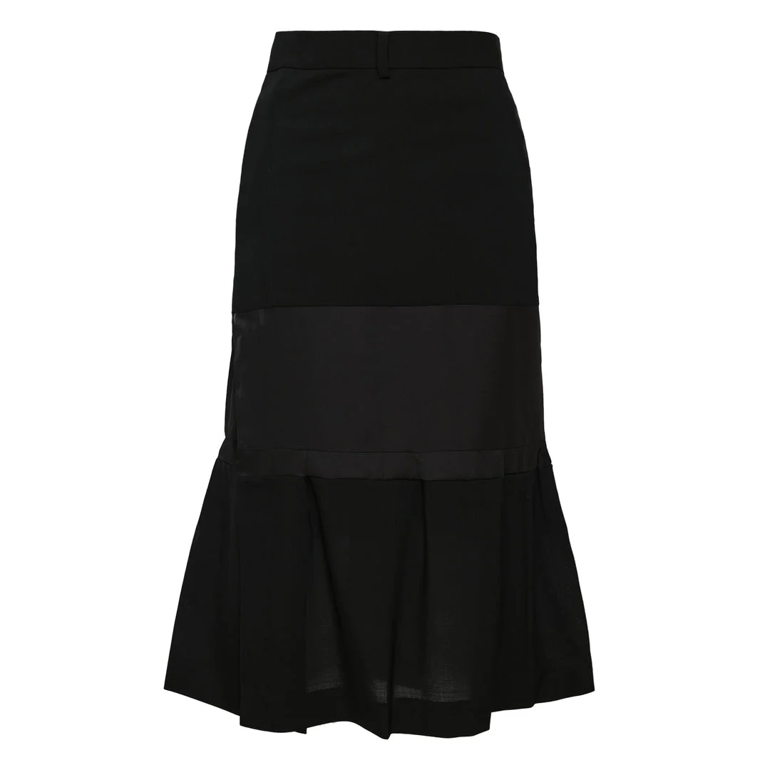 600081705BLK000 / 26-08432/00/001 - Premium wool suiting construction - High waistband with hook and zip closure - Mixed fabric panel detailing - Asymmetric tiered hem design - Midi length silhouette - Structured fit through waist The sacai Wool Suiting Skirt delivers avant-garde femininity with sophisticated tailoring and hybrid construction techniques. Crafted from premium wool suiting fabric in classic black, featuring the brand's signature mixed-material approach with contrasting panel details. The structured silhouette and deconstructed elements create a contemporary statement piece that bridges formal and casual aesthetics.