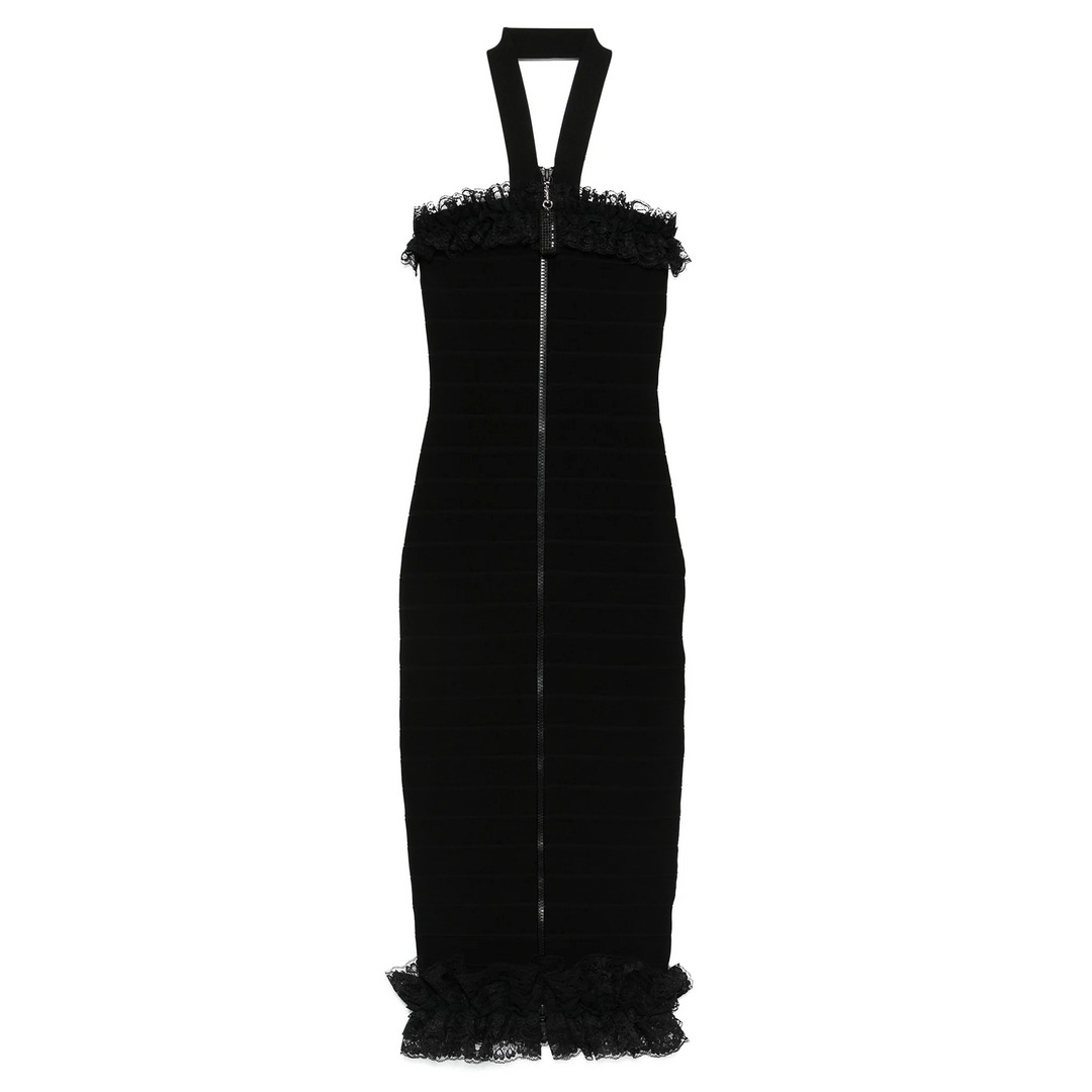 Black Knit Zip Ruffle Midi Dress