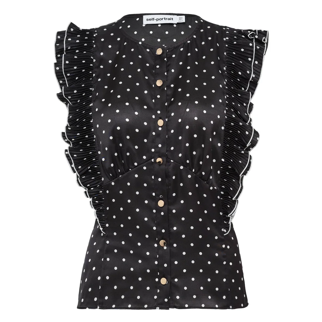 600082950DOT004 / SS26-099T-B/00/BLACK - White polka dot print on black base - Dramatic pleated ruffle sleeves - Gold-tone button front closure - Stand collar neckline - Lightweight woven construction - Fitted silhouette - Sleeveless design with ruffle details Self-Portrait Black Polka Dot Frill Top delivers romantic femininity with contemporary edge and sophisticated detailing. Crafted from lightweight woven fabric in classic black with white polka dots, featuring dramatic pleated ruffles along the sleeves and sides. The structured silhouette with gold-tone button closure creates an elegant statement piece perfect for elevated styling.