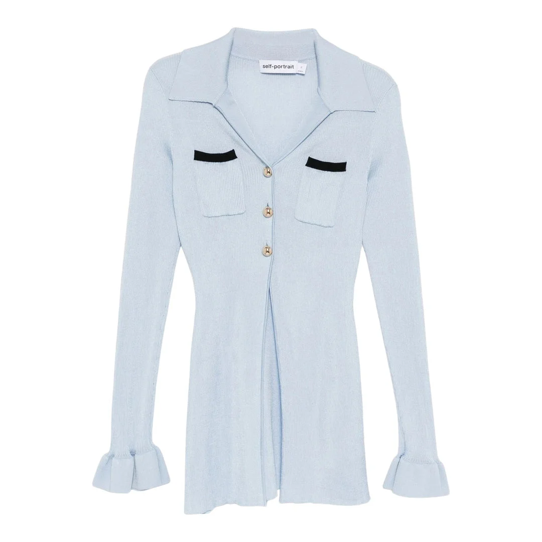 600070609LBL00M / PF25-046T-BL/00/BLUE - Ribbed viscose knit construction - Button-front closure with three buttons - Contrasting black trim on chest pockets - Long sleeves with flared cuffs - Longline silhouette - Notched lapel collar - Relaxed fit Self-Portrait Blue Ribbed Longline Top delivers feminine sophistication with versatile layering appeal. Crafted from soft ribbed viscose knit in powder blue, featuring contrasting black trim details and flared cuff sleeves. The longline silhouette and button-front closure create an elegant cardigan-style piece perfect for contemporary dressing.