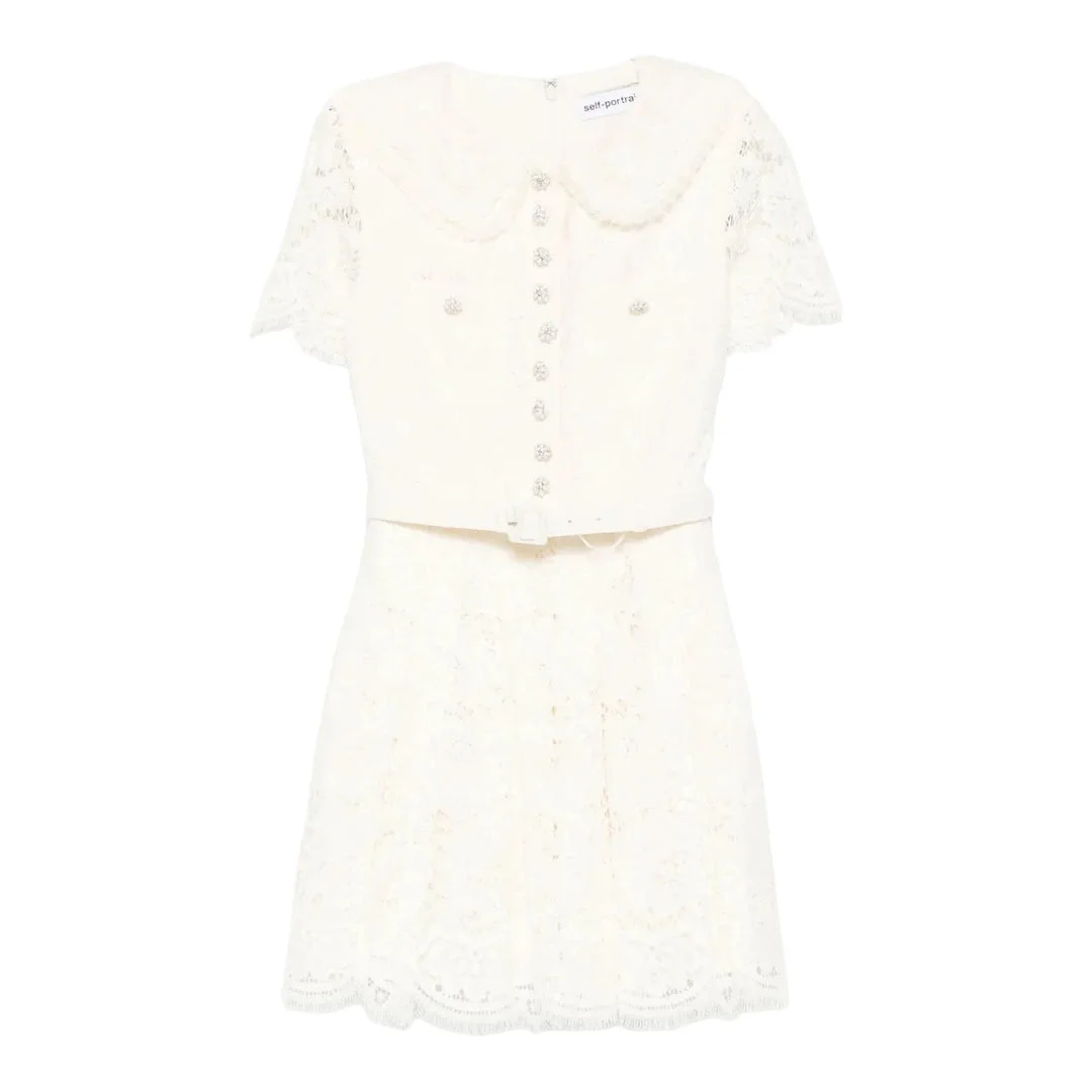 300048731OWT-06 / A5AW25-100S-C/00/CREAM - Intricate floral lace construction - Mini dress length - Round neckline - Short sleeves - Fitted bodice silhouette - Delicate cream color palette - Fully lined interior Self-Portrait Cream Floral Lace Mini Dress delivers romantic femininity with intricate craftsmanship and contemporary silhouette. Crafted from delicate floral lace in soft cream tones, featuring the brand's signature attention to detail and luxurious texture. The mini length and refined lace construction create an elegant statement piece perfect for special occasions.