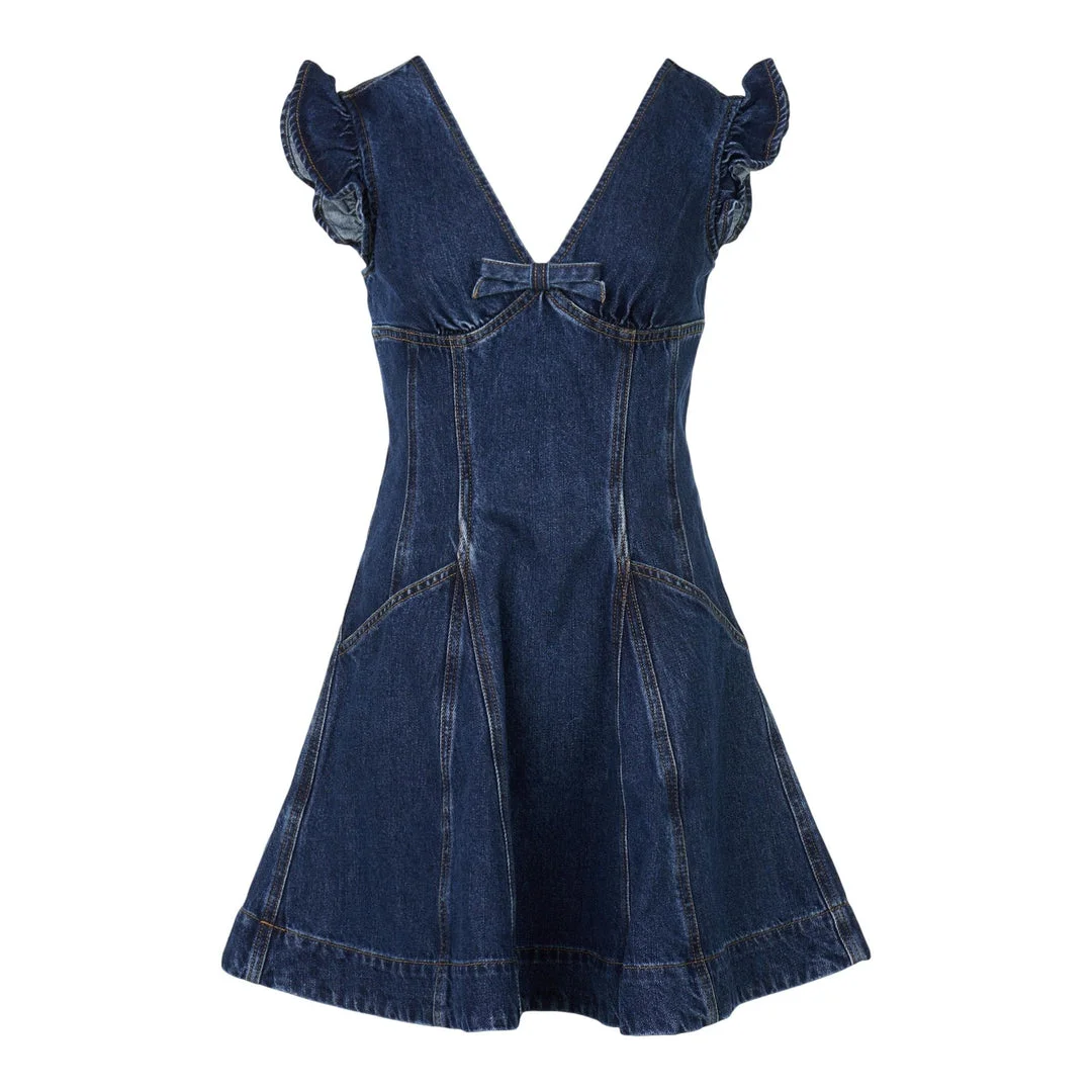 300048742BLU-06 / A5AW25-817S-BL/00/BLUE - Sweetheart neckline with V-shaped front - Ruffle cap sleeves - Decorative bow detail at bust - Fitted bodice with princess seams - A-line flared mini skirt - Medium-weight denim construction - Back zip closure - Classic indigo wash Self-Portrait Denim Flared Mini Dress delivers contemporary femininity with vintage-inspired denim construction and romantic detailing. Crafted from premium medium-weight denim in classic indigo blue, featuring structured bodice with sweetheart neckline and flared A-line skirt. The signature ruffle cap sleeves and delicate bow accent create a perfect balance of casual elegance and feminine charm.