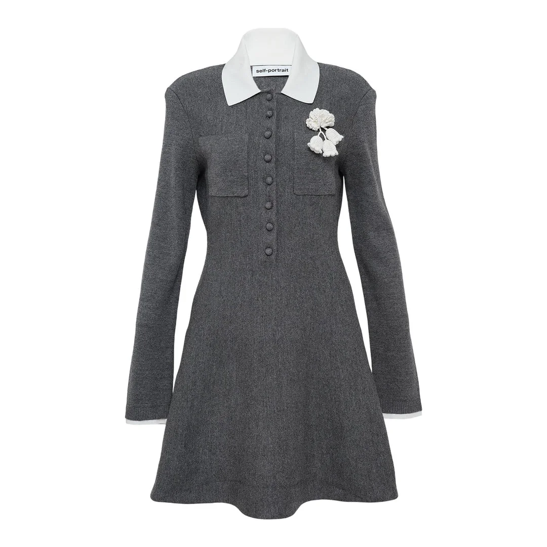 600074476GRY00S / AW25-010SA-GR/00/GREY - Contrast white collar detail - Button-front closure - Crochet flower embellishment - Long sleeves with fitted cuffs - A-line silhouette - Above-knee length - Premium knit construction Self-Portrait Grey Crochet Flower Collared Dress delivers feminine elegance with contemporary sophistication. Crafted from premium knit fabric in heather grey, featuring a contrast white collar and delicate crochet flower embellishment at the chest. The structured bodice with button-front closure and A-line silhouette creates a refined statement piece perfect for modern wardrobes.