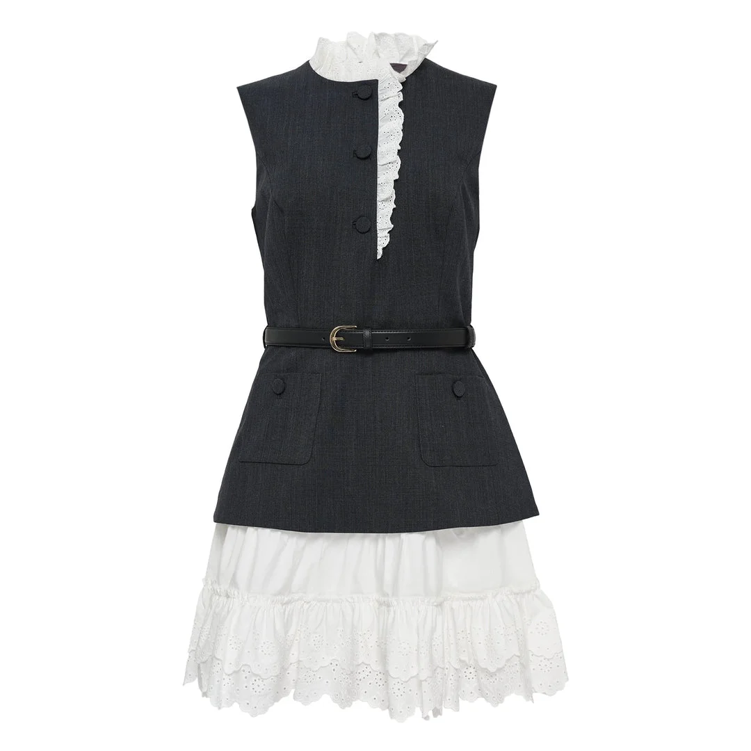 600082945GRY004 / SS26-082S-GR/00/GREY - Wool-cotton blend construction - Sleeveless design with high neckline - Button-front closure with white lace trim - Included leather belt with gold-tone buckle - White cotton eyelet tiered skirt overlay - Front patch pockets - Mini length silhouette - Partially lined Self-Portrait Grey Wool Cotton Frill Mini Dress delivers contemporary femininity with structured tailoring and romantic detailing. Crafted from premium wool-cotton blend in charcoal grey, featuring white lace trim collar and tiered eyelet cotton skirt overlay. The sleeveless silhouette with button-front closure and coordinating belt creates a sophisticated contrast between minimalist and romantic aesthetics.