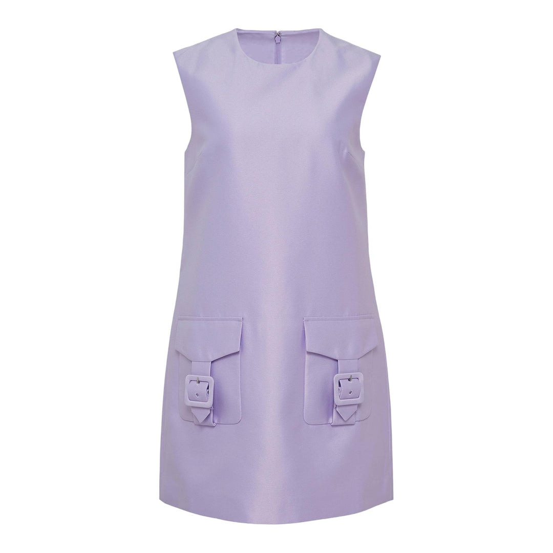 600070587LIL004 / PF25-016SA-L/00/LILAC - Sleeveless A-line design - Round neckline - Back zip closure - Two front flap pockets with buckle details - Lustrous taffeta construction - Mini length - Structured fit Self-Portrait Lilac Taffeta Mini Dress delivers contemporary feminine elegance with structured sophistication. Crafted from lustrous taffeta in soft lilac, featuring a sleeveless A-line silhouette with distinctive front flap pockets and buckle details. The modern mini length and architectural pocket construction create a statement piece that balances playful charm with refined tailoring.
