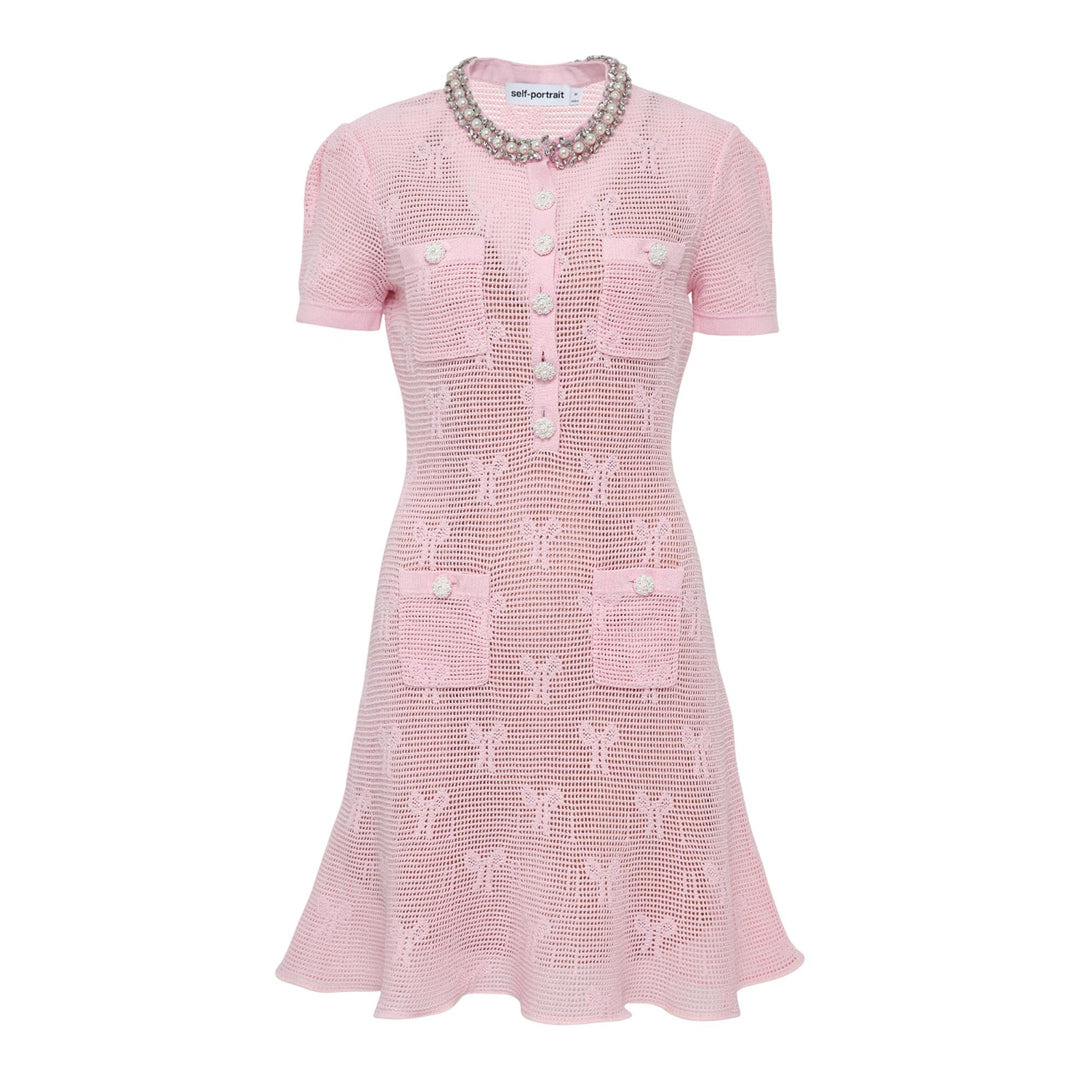 Self-Portrait Pink Bow Crochet Crystal Trim Dress
