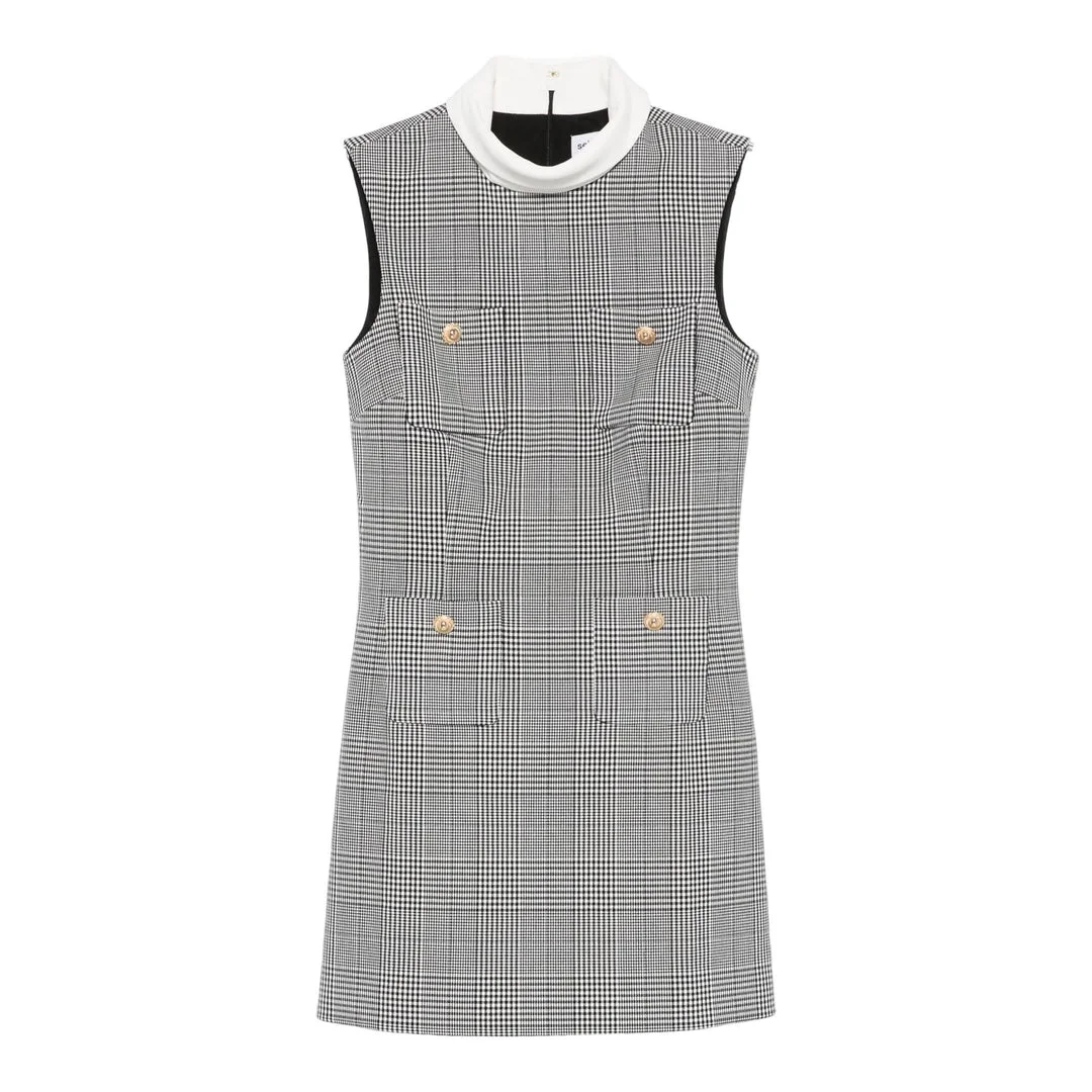 600070586CHK012 / PF25-016S-BW/00/BLACK AND WHIT - Prince of Wales check pattern - Contrast white collar - Gold-tone button details - Sleeveless design - Mini length - Fitted silhouette - Structured woven fabric - Back zip closure Self-Portrait Sleeveless Prince Of Wales Check Mini Dress delivers sophisticated tailoring with contemporary feminine elegance. Crafted from structured check fabric in classic black and white houndstooth pattern, featuring contrast white collar detailing and gold-tone button accents. The fitted silhouette and timeless Prince of Wales pattern create a refined statement piece for modern wardrobes.