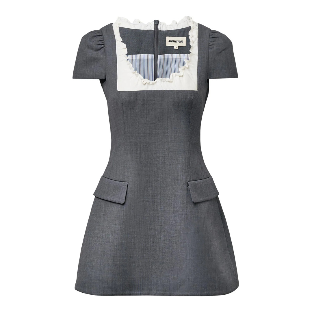 SHUSHU/TONG Scalloped Short Sleeve Dress delivers contemporary feminine elegance with architectural detailing and sophisticated construction. Crafted from premium charcoal wool suiting fabric with contrasting white cotton bib front featuring delicate scalloped trim and blue striped lining. The structured silhouette and signature decorative pockets create a modern take on classic tailoring with playful romantic elements.