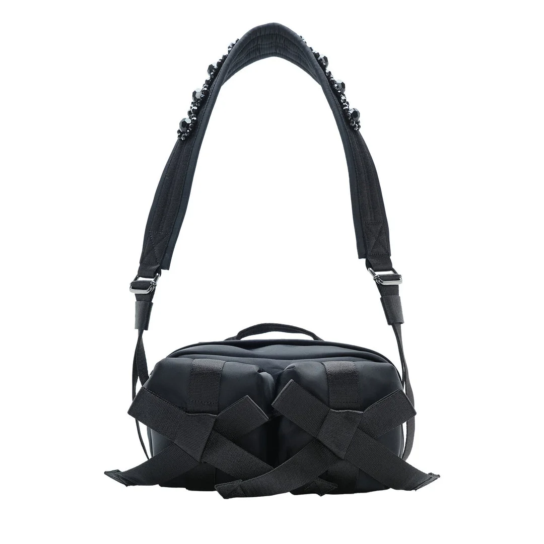 600064170BLK0OS / SS25-BAG149B 0761/00/BLACK/JET - Beaded shoulder strap detailing - Oversized bow construction with ribbon ties - Adjustable crossbody strap - Top handle for versatile carrying - Structured black fabric construction - Compact crossbody size - Metal hardware accents Simone Rocha Beaded Classic Bow Crossbody delivers romantic femininity with avant-garde craftsmanship and practical functionality. Crafted from structured black fabric with intricate beaded detailing along the shoulder strap, featuring the designer's signature oversized bow construction. The sculptural silhouette and dramatic ribbon ties create a statement piece that balances whimsy with contemporary sophistication.