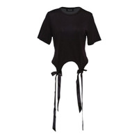 600064168BLK0XS / SS25-5223 0571/00/BLACK - Bow-tie details at hemline - Asymmetric tail construction - Short sleeves - Round neckline - Soft cotton jersey fabric - Relaxed fit - Long ribbon ties The Simone Rocha Bow Tail Easy T-Shirt delivers feminine elegance with contemporary construction and signature romantic detailing. Crafted from premium soft cotton jersey in classic black, featuring distinctive bow-tie details at the asymmetric hemline. The relaxed fit and architectural tail silhouette create a sophisticated statement piece that embodies the brand's modern femininity.