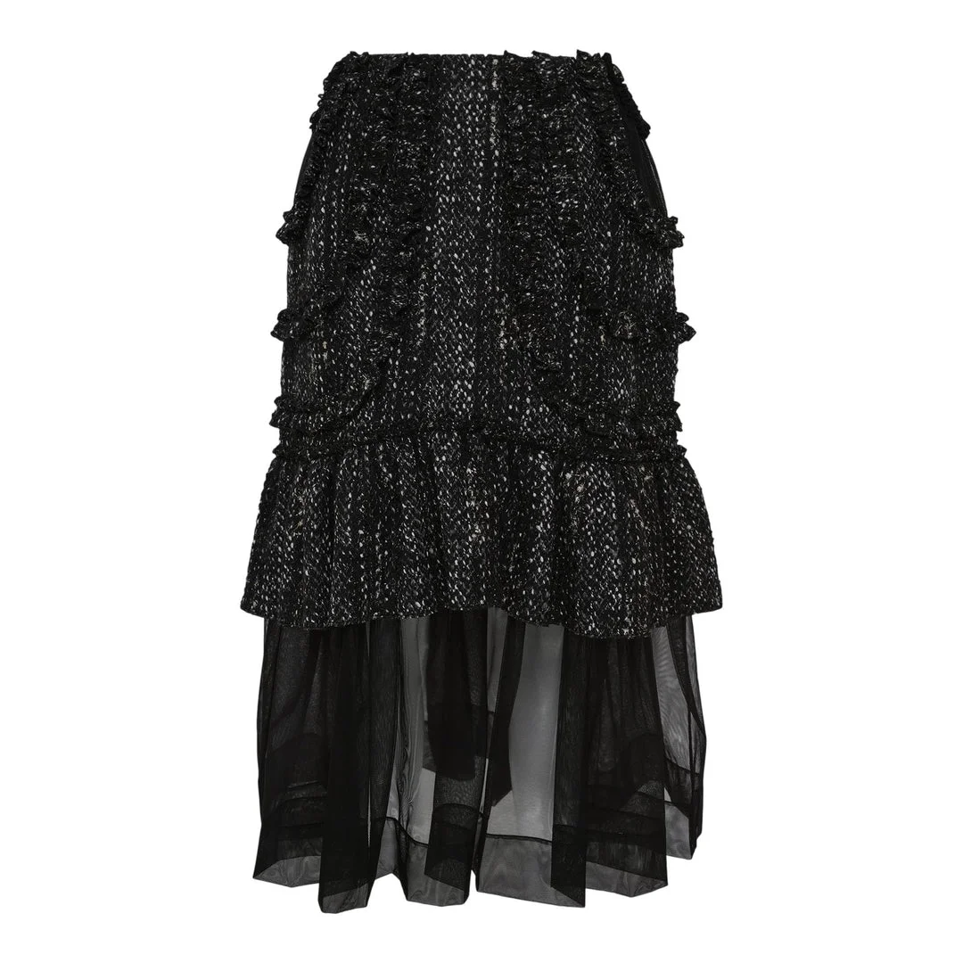 Simone Rocha Multi Frill Patchwork Fray Skirt This patchwork tweed skirt is intergrated with tulle and features frills throughout for a signature look. Perfectly paired with the Embellished Sculpted Frill Bust Fray Jacket.